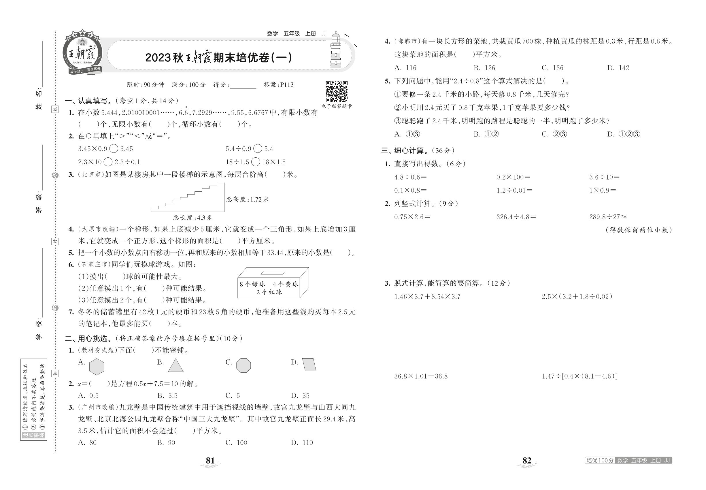 2023上册五年级数学冀教版 2023秋王朝霞期末培优卷(一)