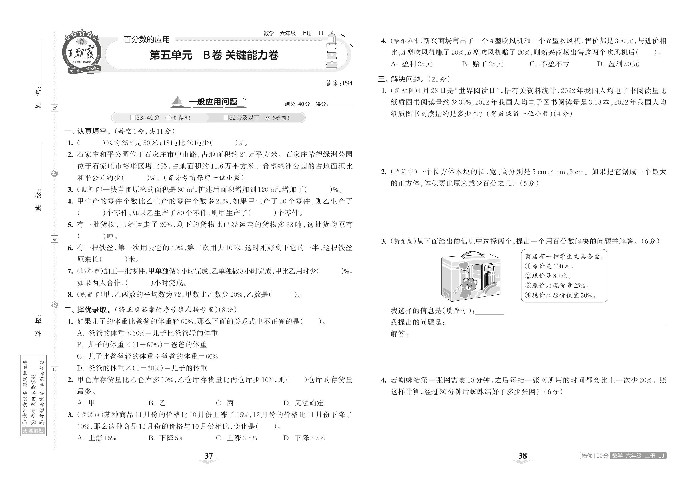 2023上册六年级数学冀教版 第五单元 B卷 关键能力卷