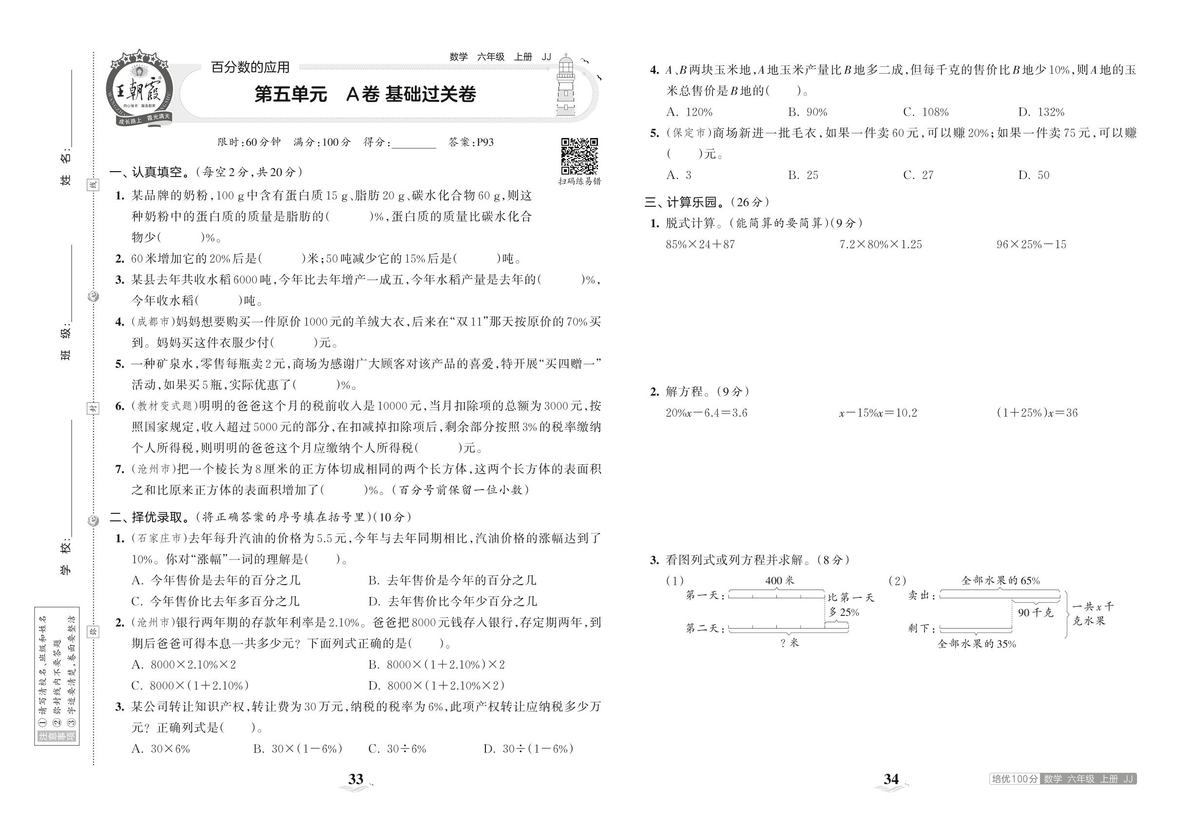 2023上册六年级数学冀教版 第五单元 A卷 基础过关卷