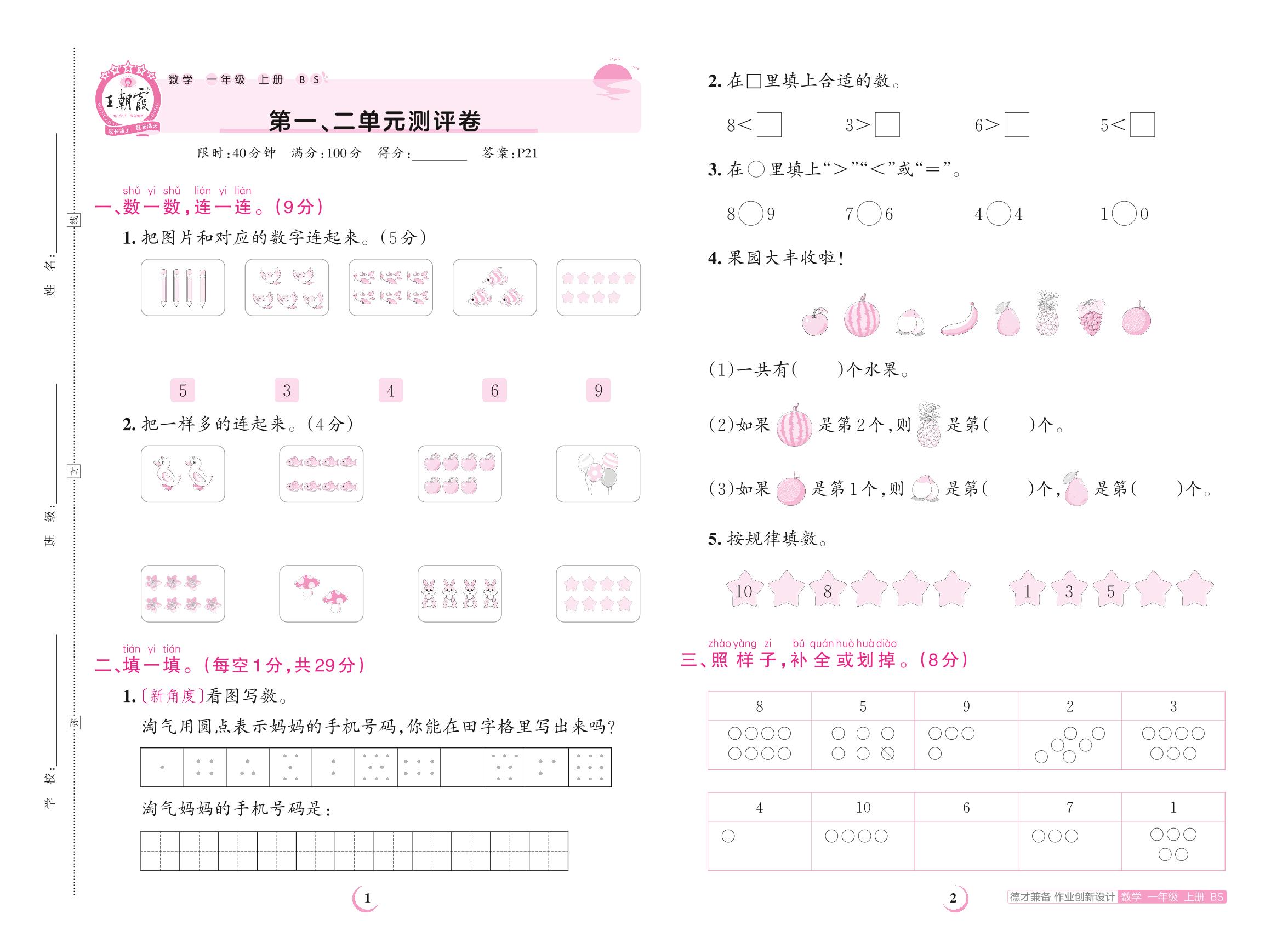2023上册一年级数学北师版 第一、二单元测评卷
