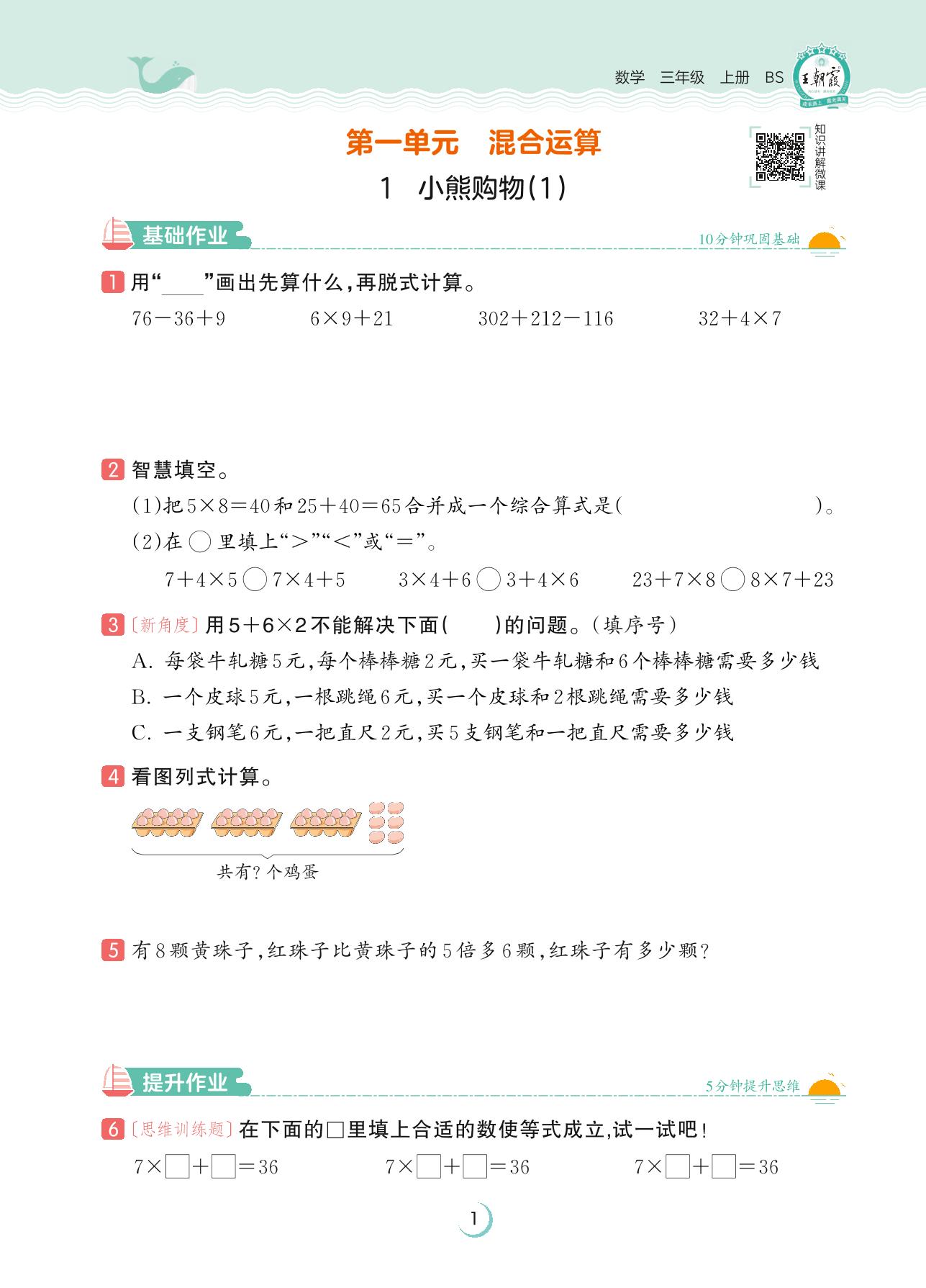 2023上册三年级数学北师版 第一单元 混合运算——1 小熊购物(1)