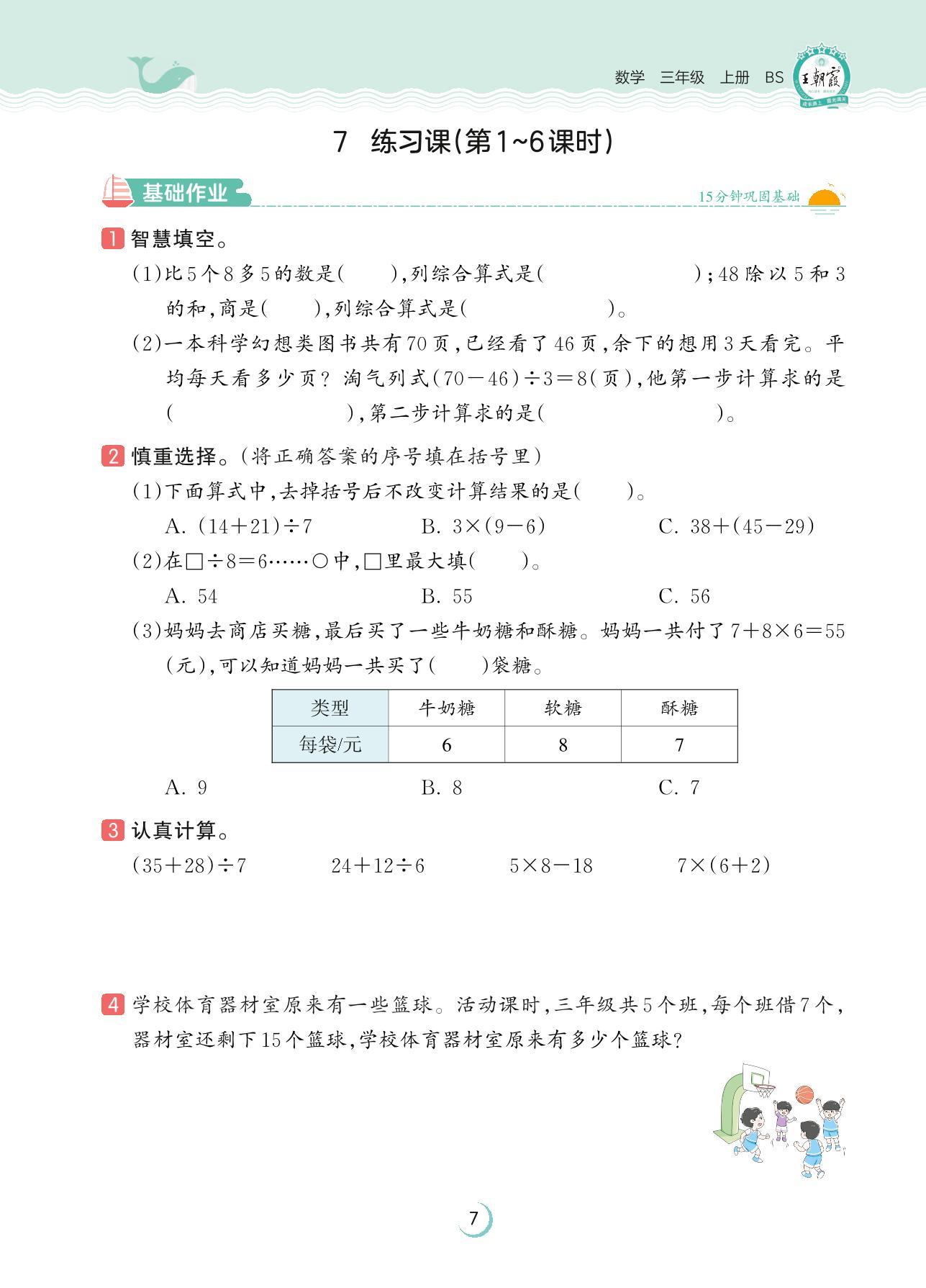 2023上册三年级数学北师版 第一单元 混合运算——7 练习课(第1~6课时)