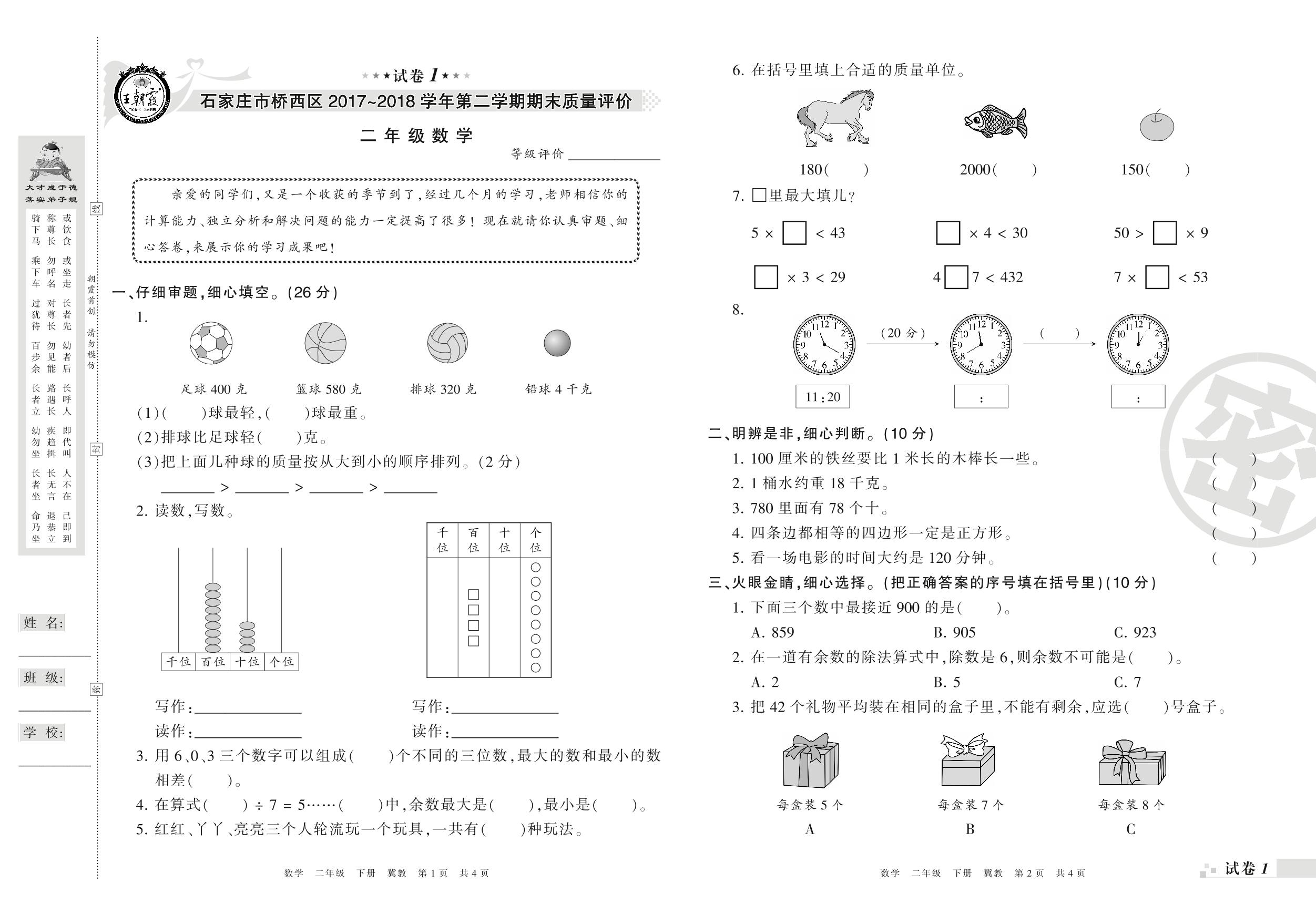 2017-2018学年第二学期石家庄市桥西区二年级数学试卷(冀教版)【1】