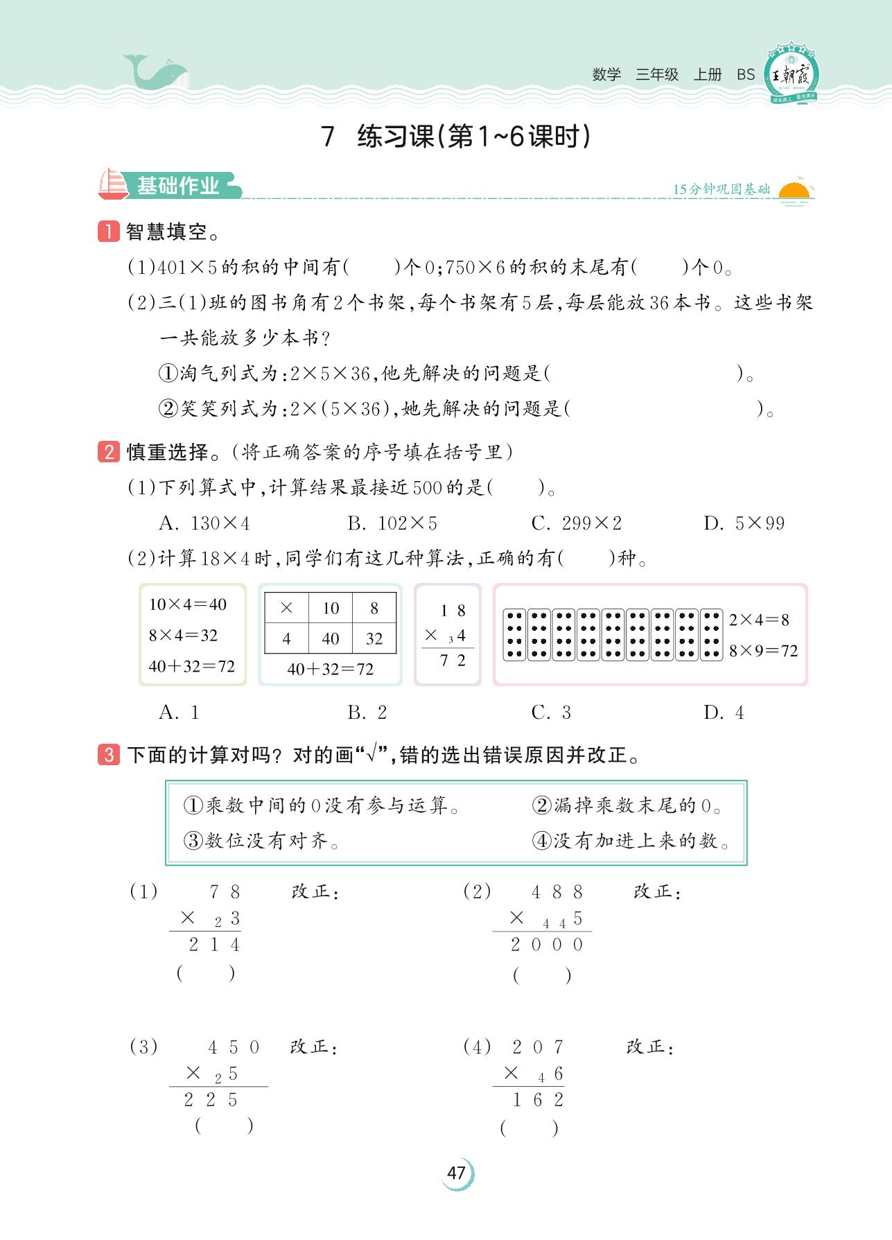 2023上册三年级数学北师版 第六单元 乘法——7 练习课(第1~6课时)