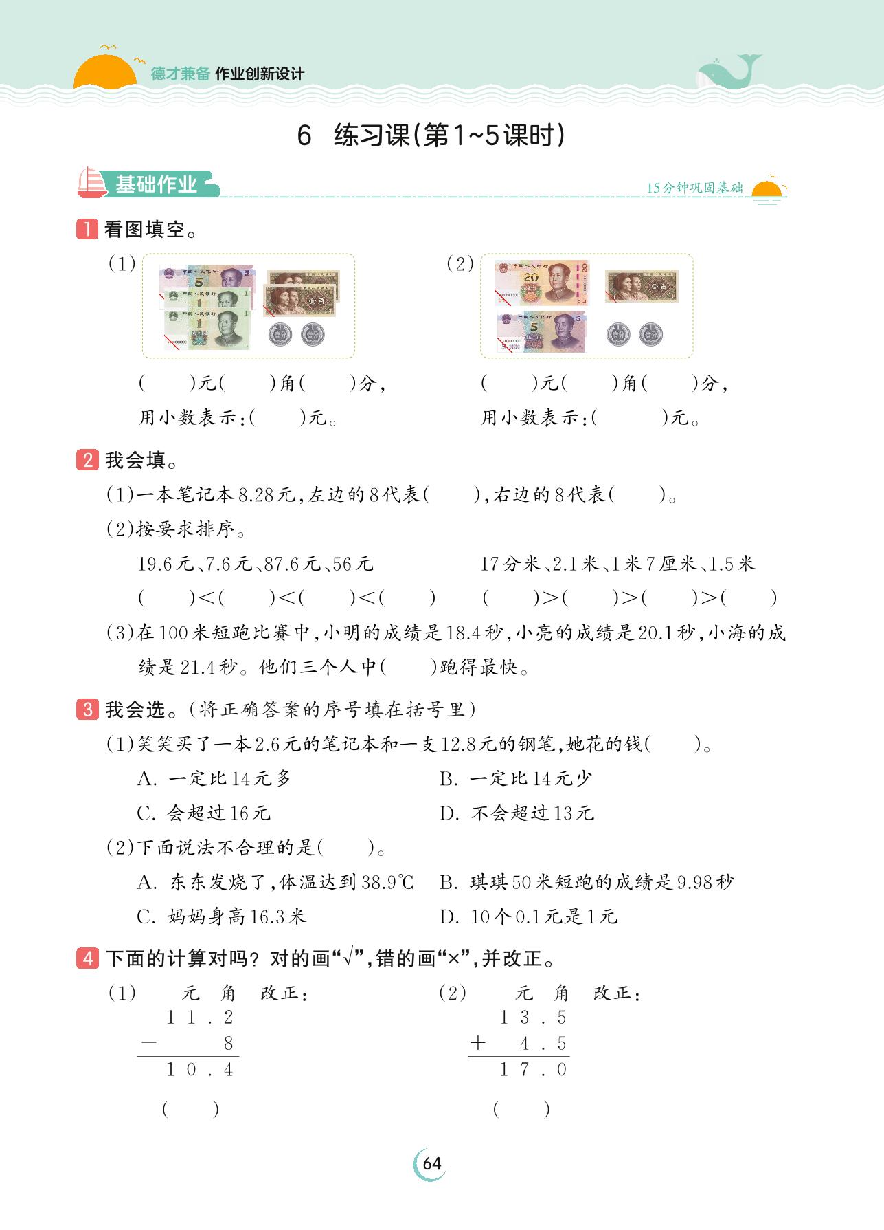 2023上册三年级数学北师版 第八单元 认识小数——6 练习课(第1~5课时)