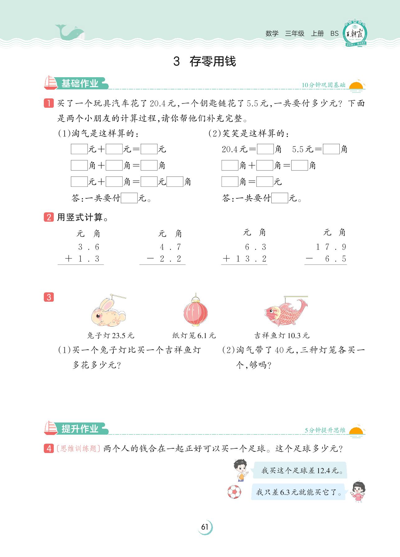 2023上册三年级数学北师版 第八单元 认识小数——3 存零用钱