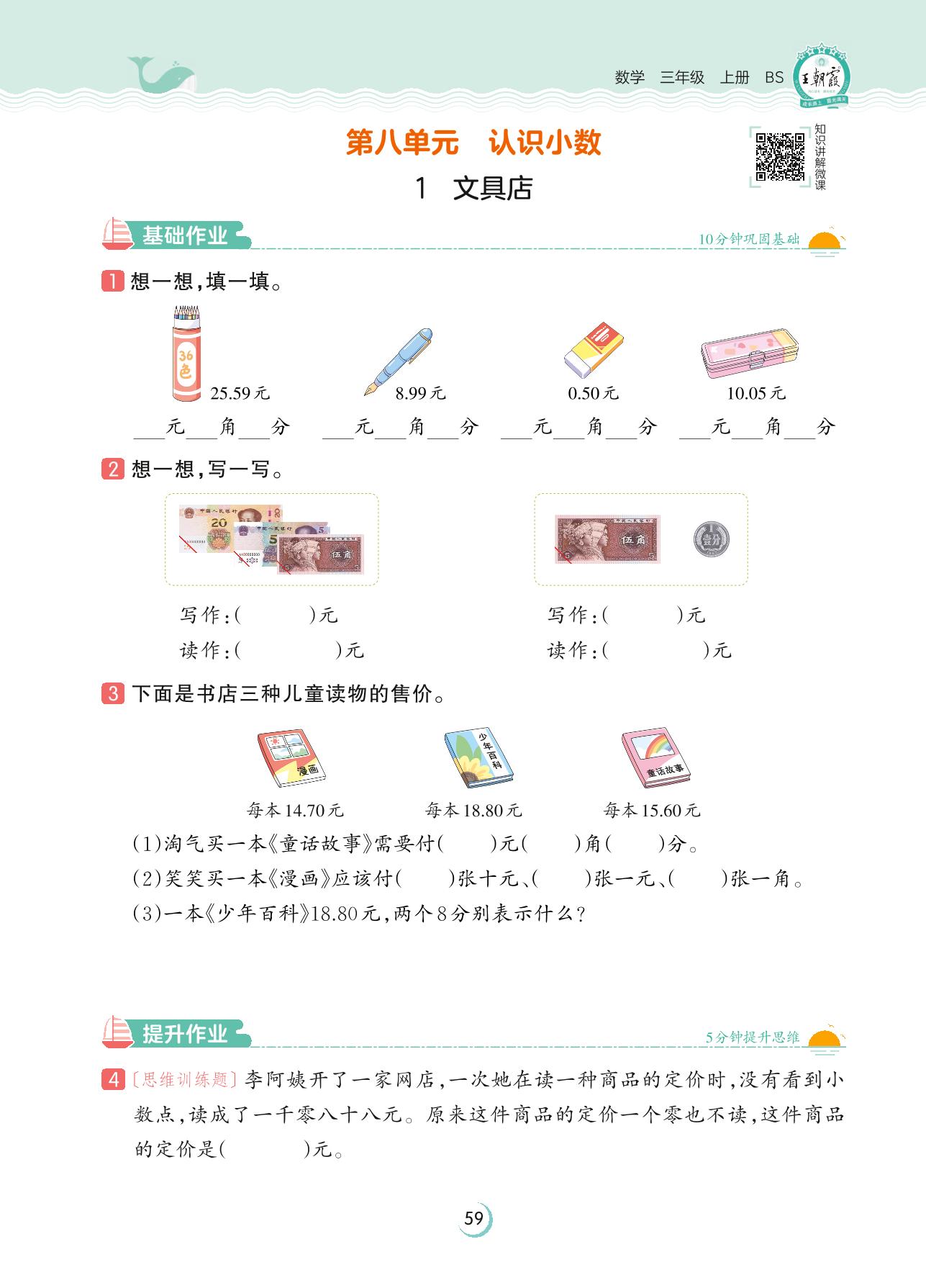 2023上册三年级数学北师版 第八单元 认识小数——1 文具店