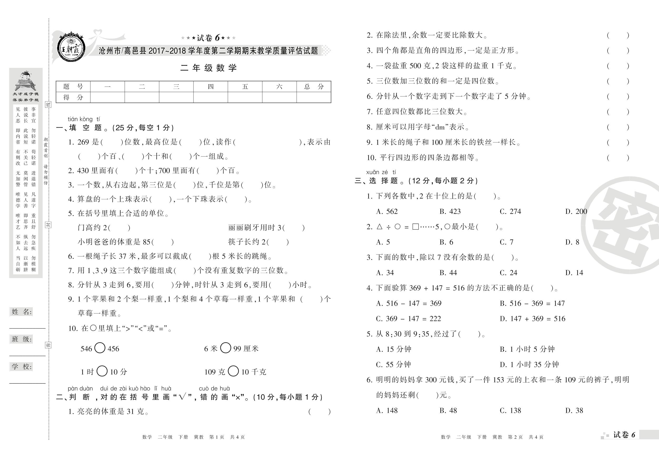 2017-2018学年第二学期沧州市、高邑县二年级数学试卷(冀教版)【6】