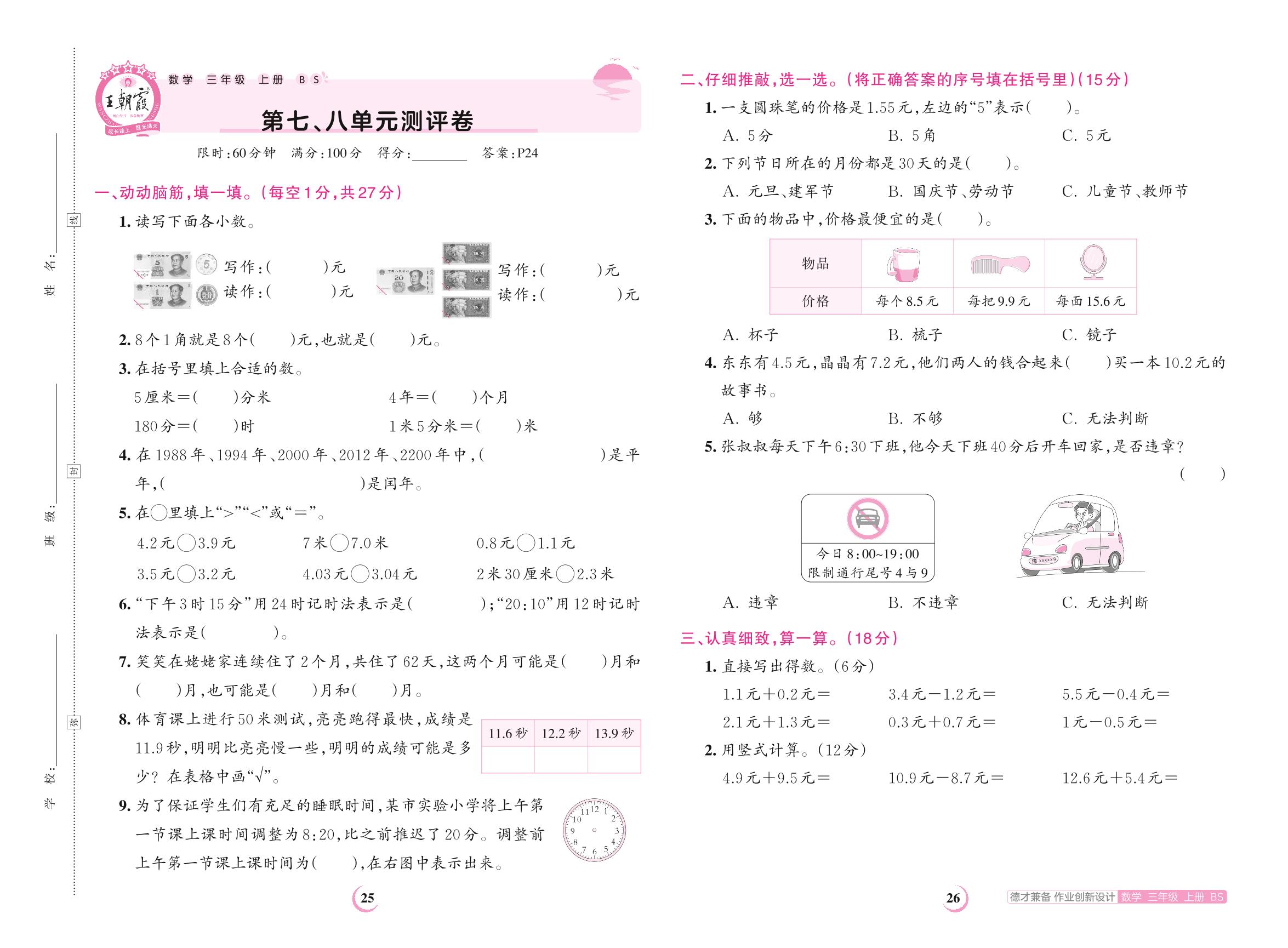 2023上册三年级数学北师版 第七、八单元测评卷