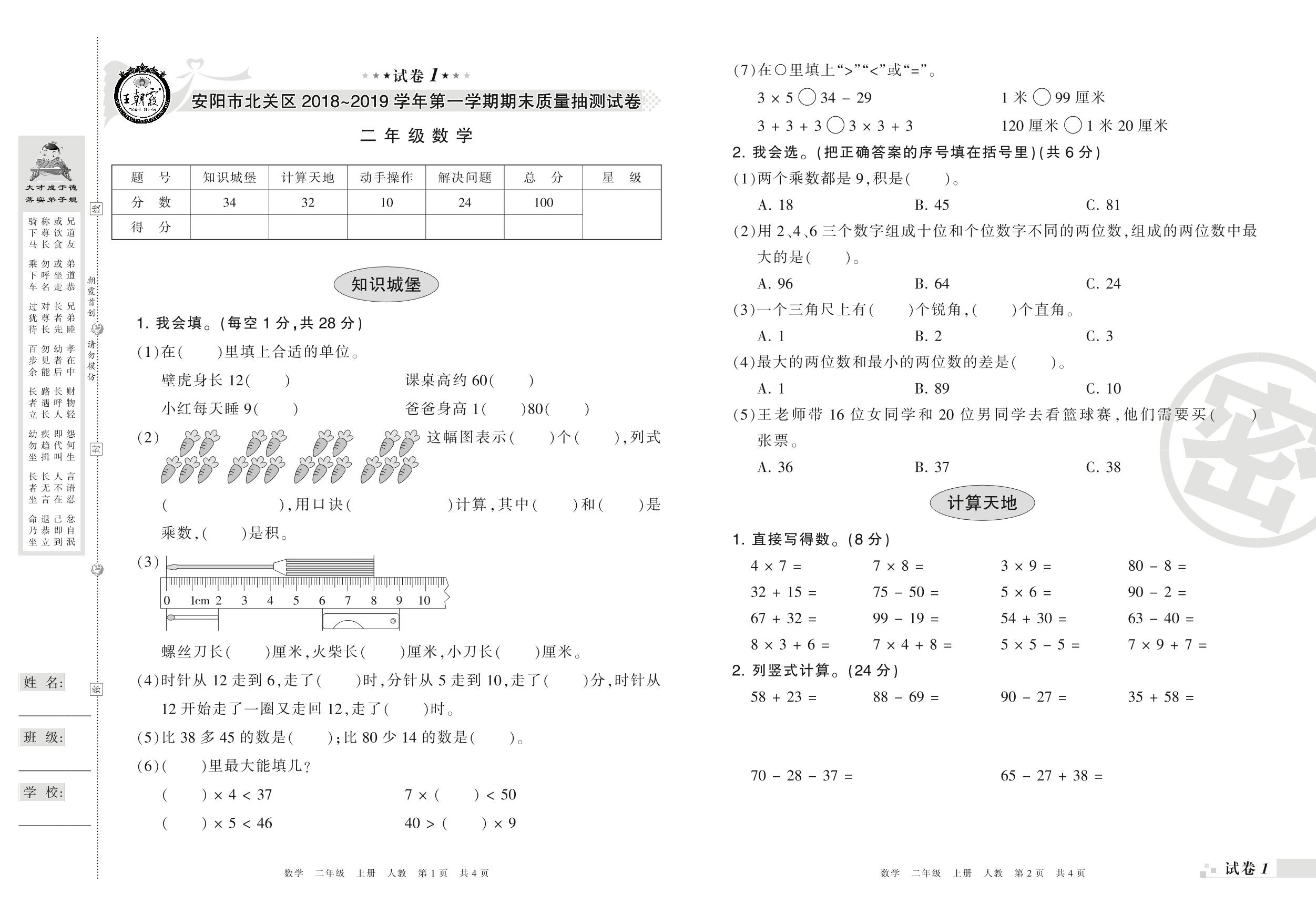 2018-2019学年第一学期安阳市北关区二年级数学试卷(人教版)【1】