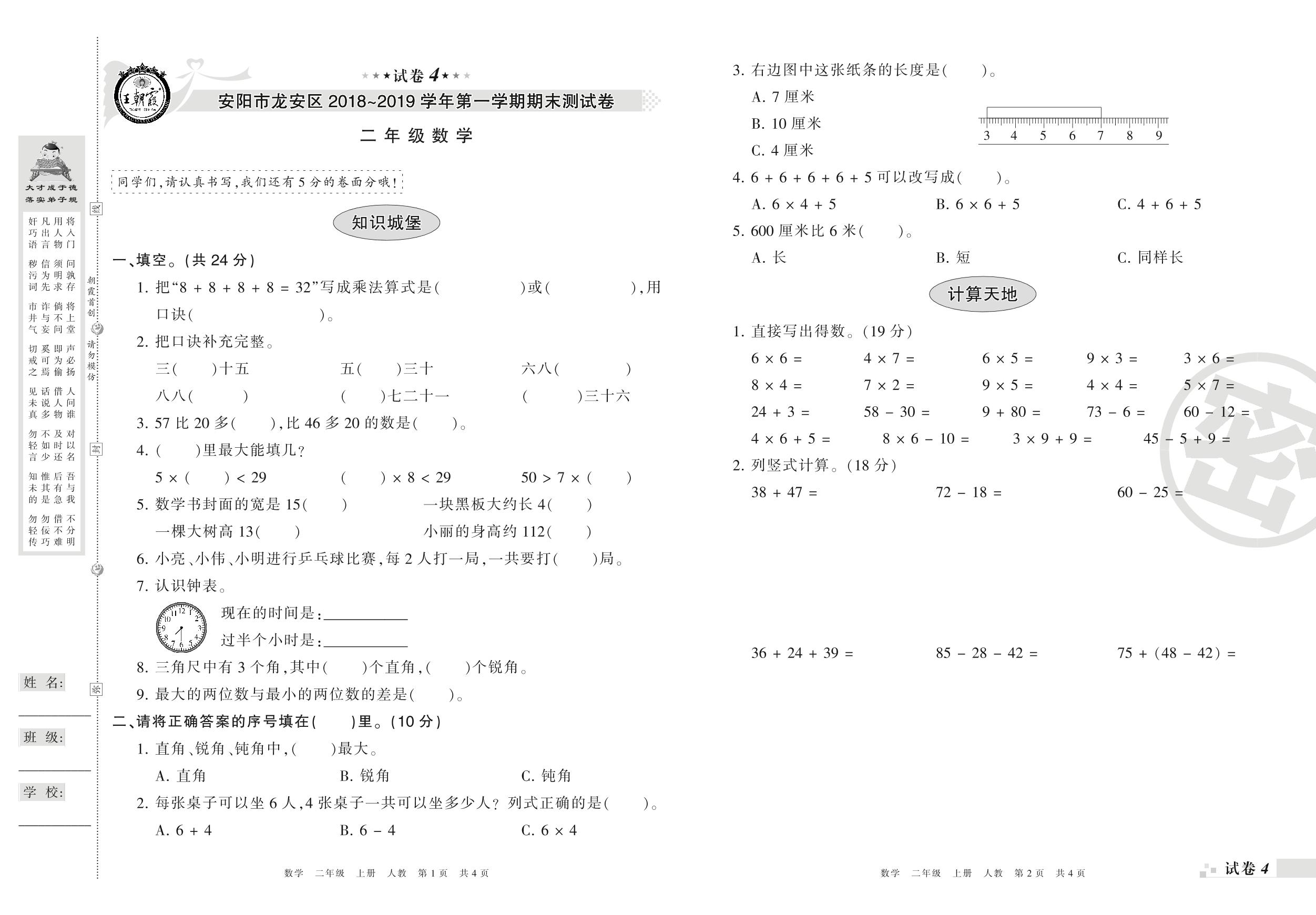 2018-2019学年第一学期安阳市龙安区二年级数学试卷(人教版)【4】