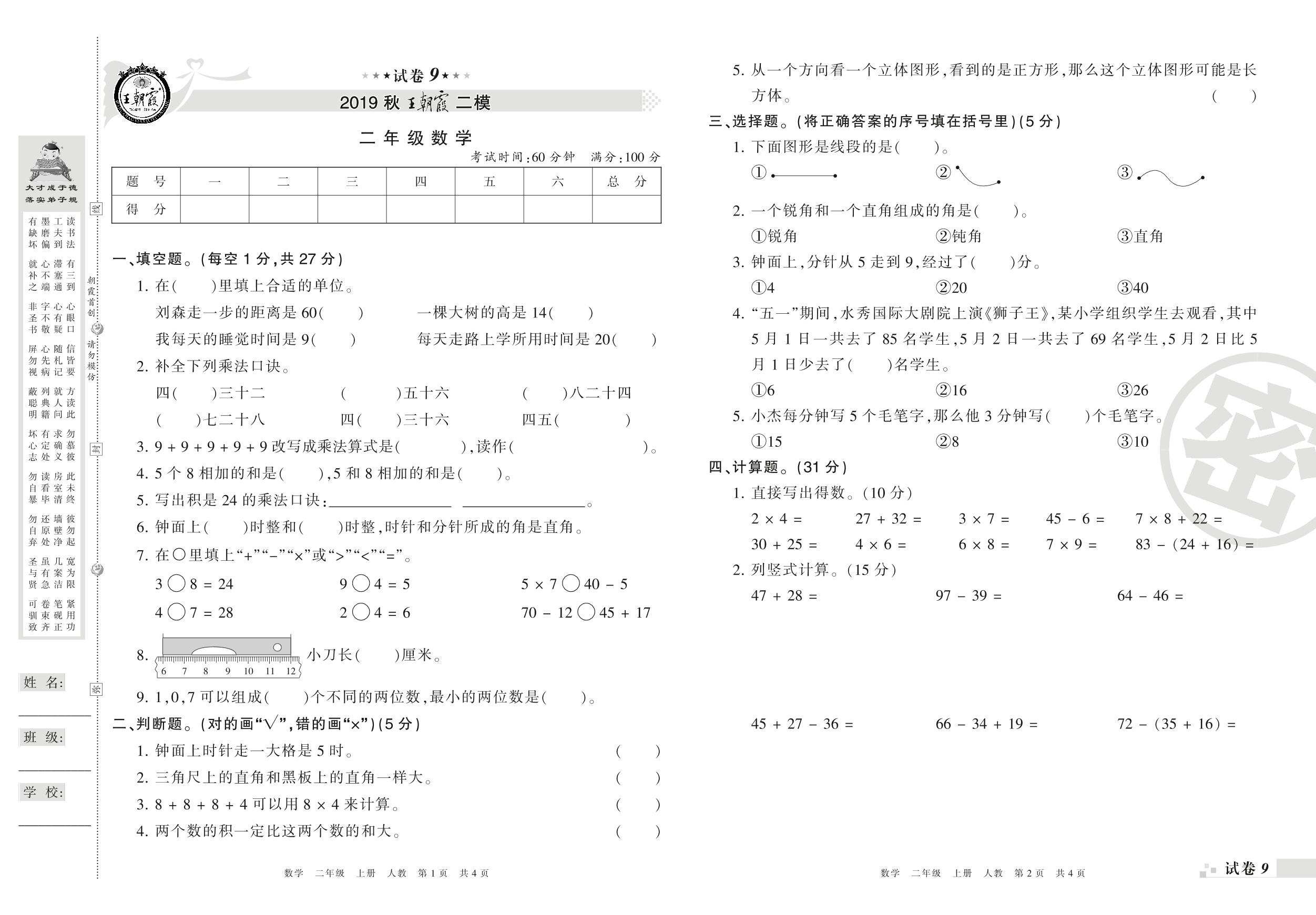 王朝霞期末模拟卷二年级上册数学(人教版)_R21080393919【9】