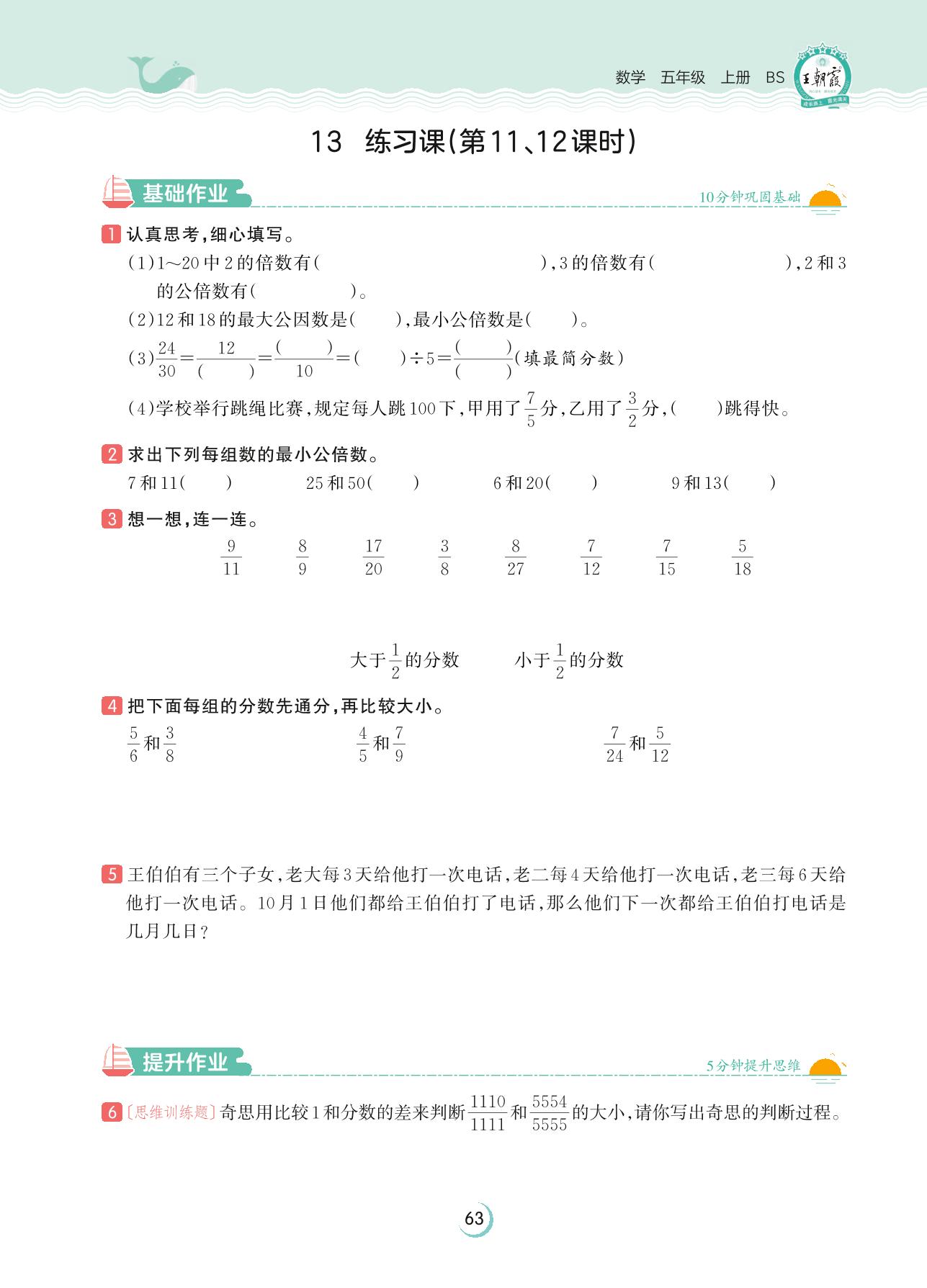 2023上册五年级数学北师版 第五单元 分数的意义——13 练习课(第11、12课时)