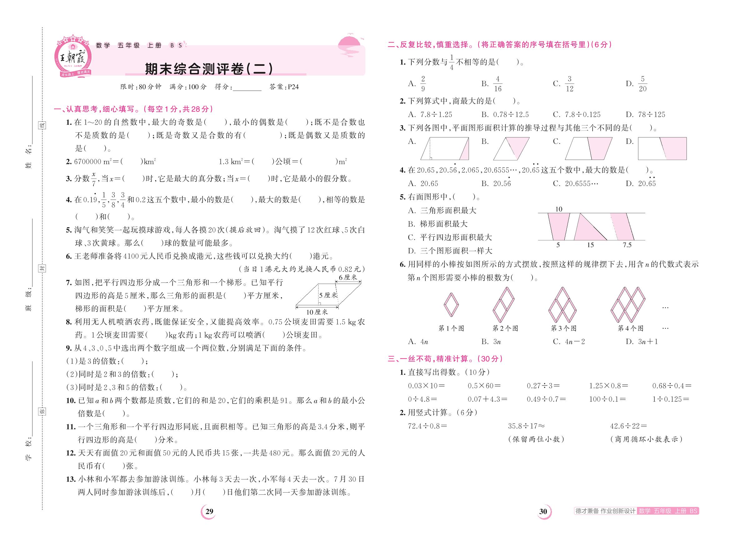 2023上册五年级数学北师版 期末综合测评卷(二)