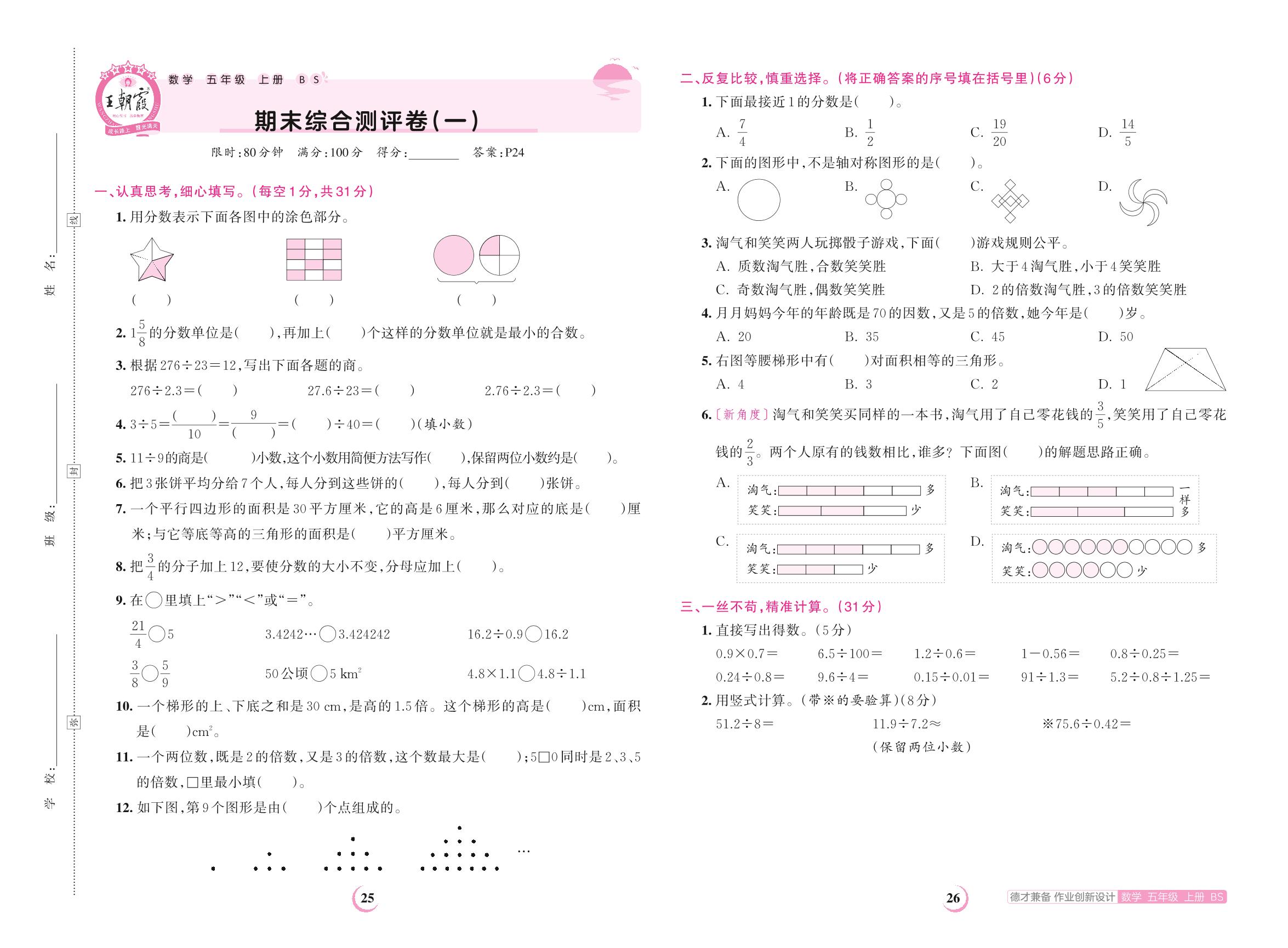 2023上册五年级数学北师版 期末综合测评卷(一)