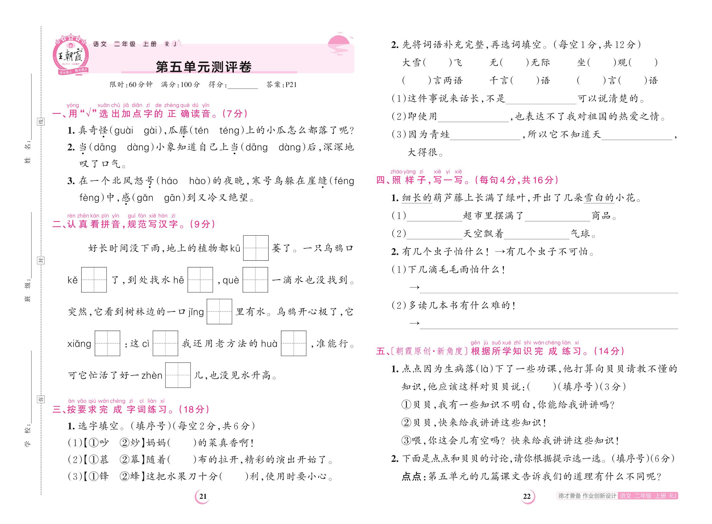 2023上册二年级语文人教版 第五单元测评卷