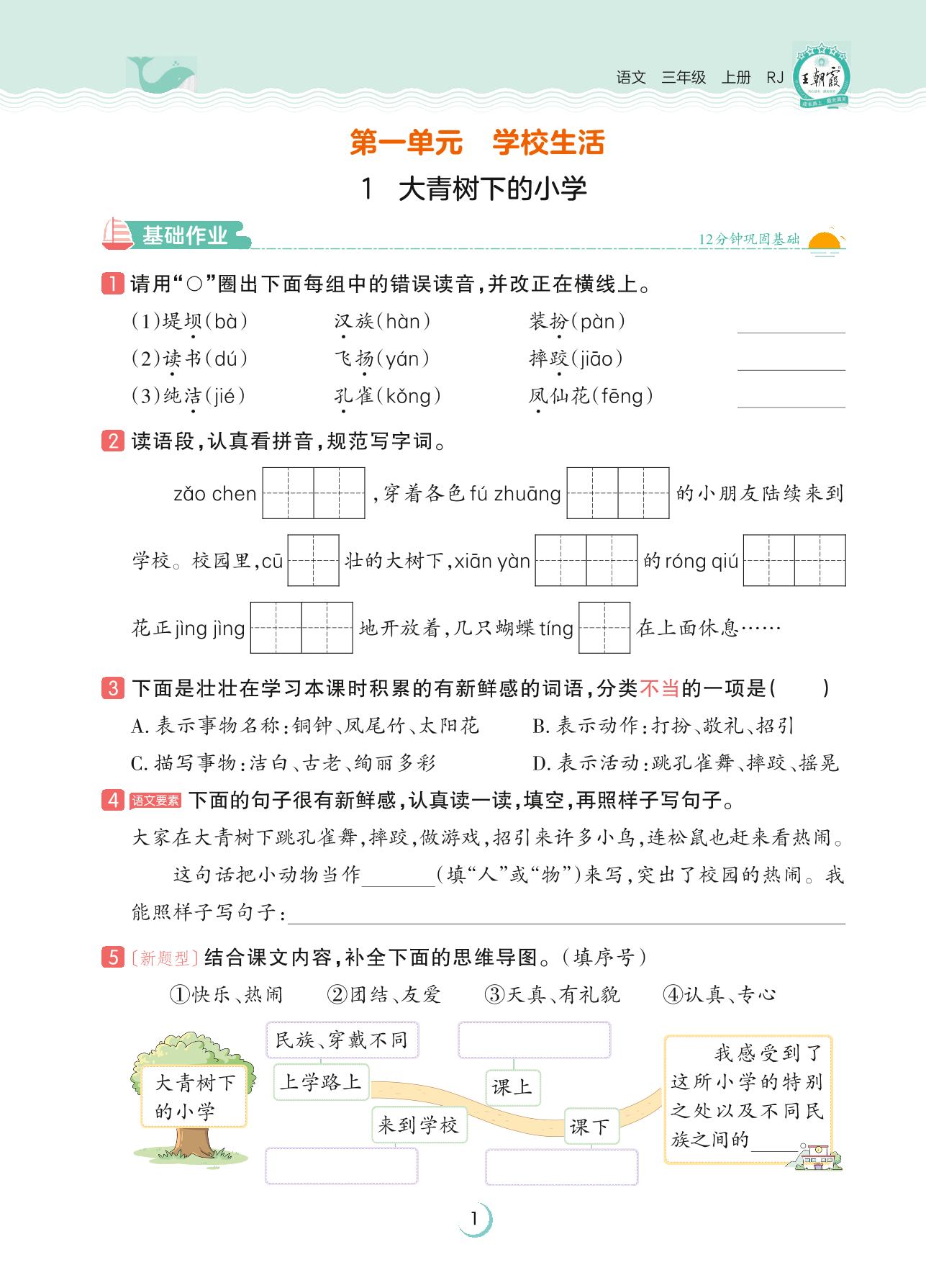2023上册三年级语文人教版 第一单元 学校生活——1 大青树下的小学