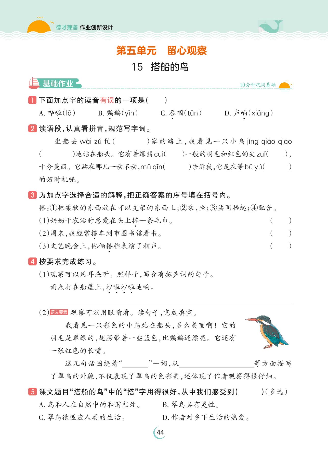 2023上册三年级语文人教版 第五单元 留心观察——15 搭船的鸟