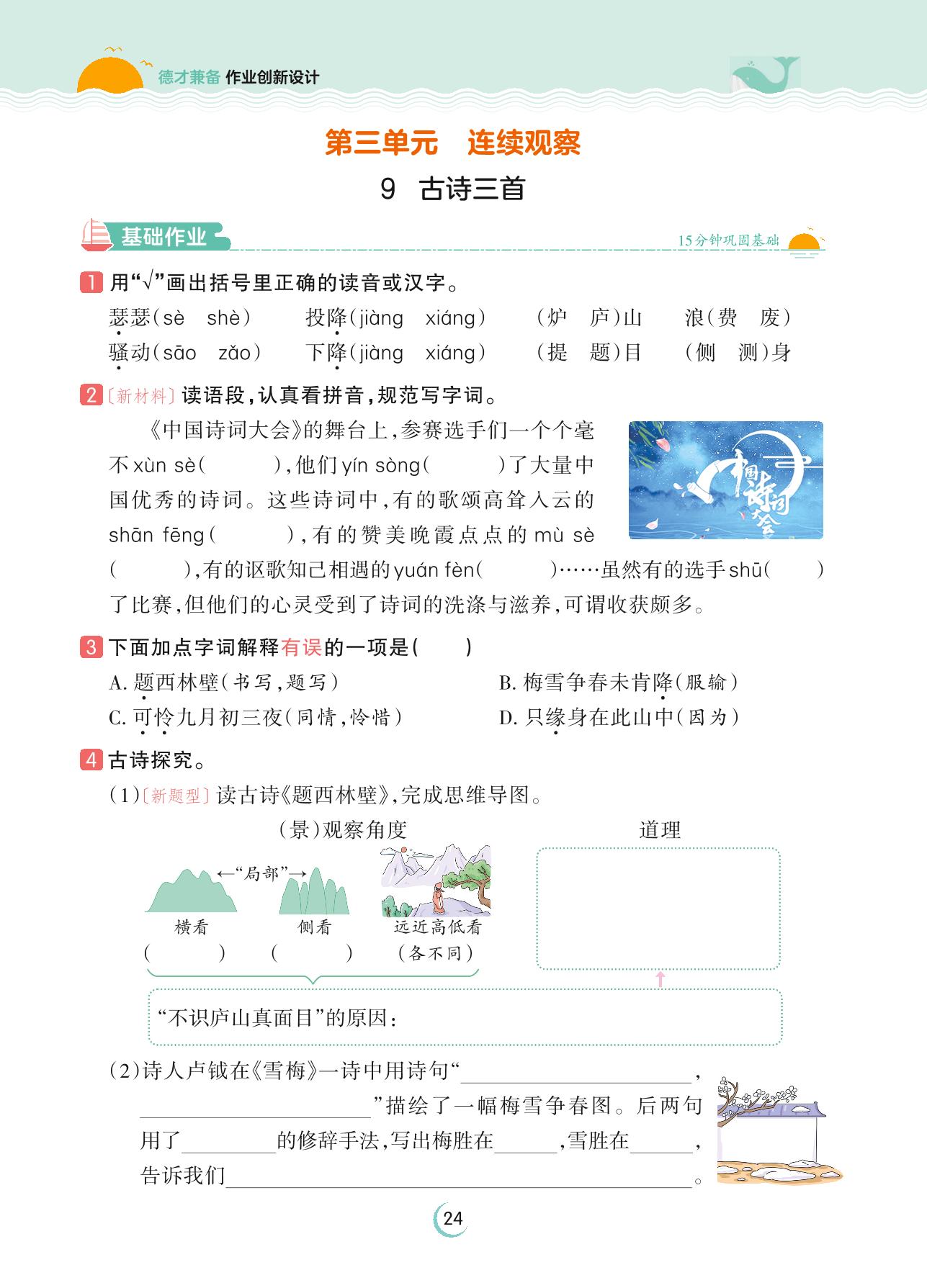 2023上册四年级语文人教版 第三单元 连续观察——9 古诗三首