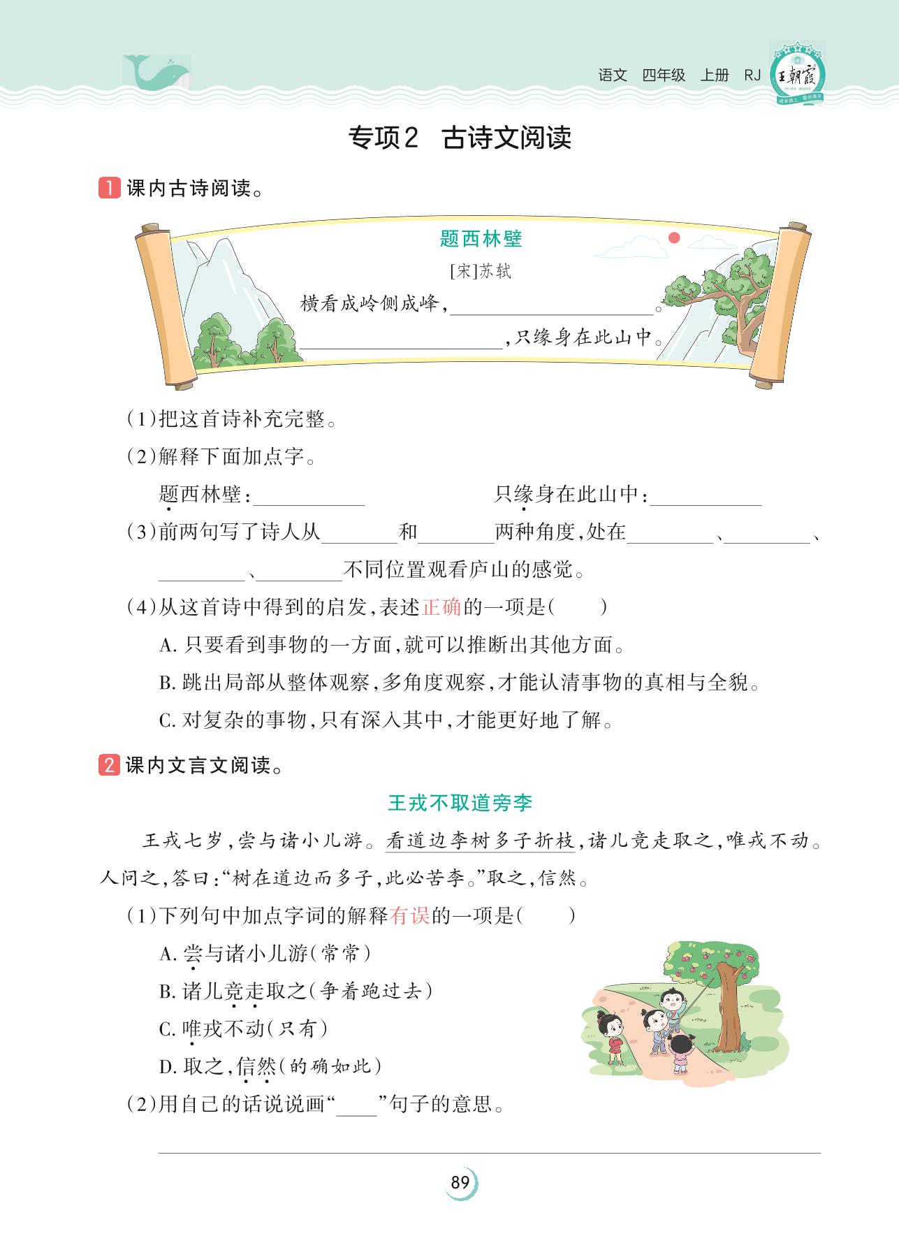 2023上册四年级语文人教版 新题新视野 专项训练——专项2 古诗文阅读