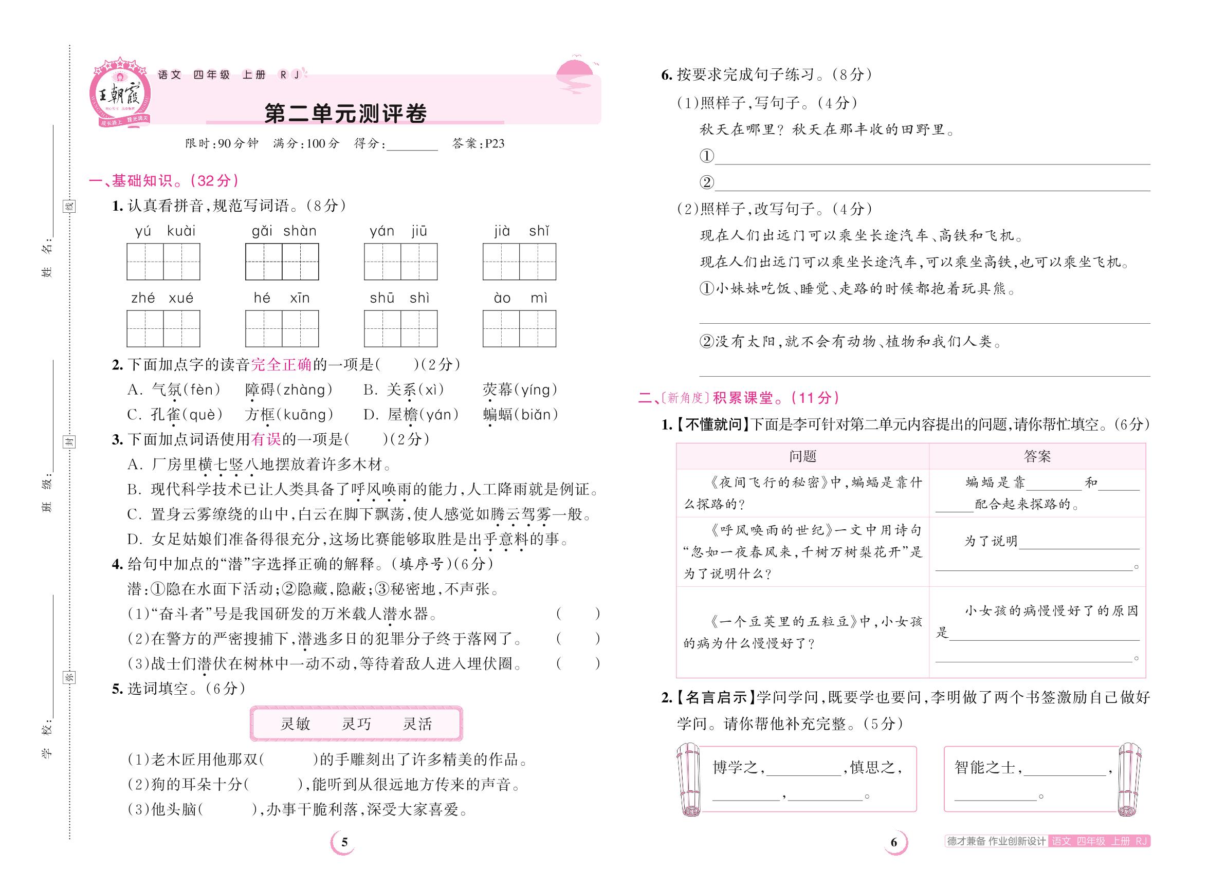 2023上册四年级语文人教版 第二单元测评卷
