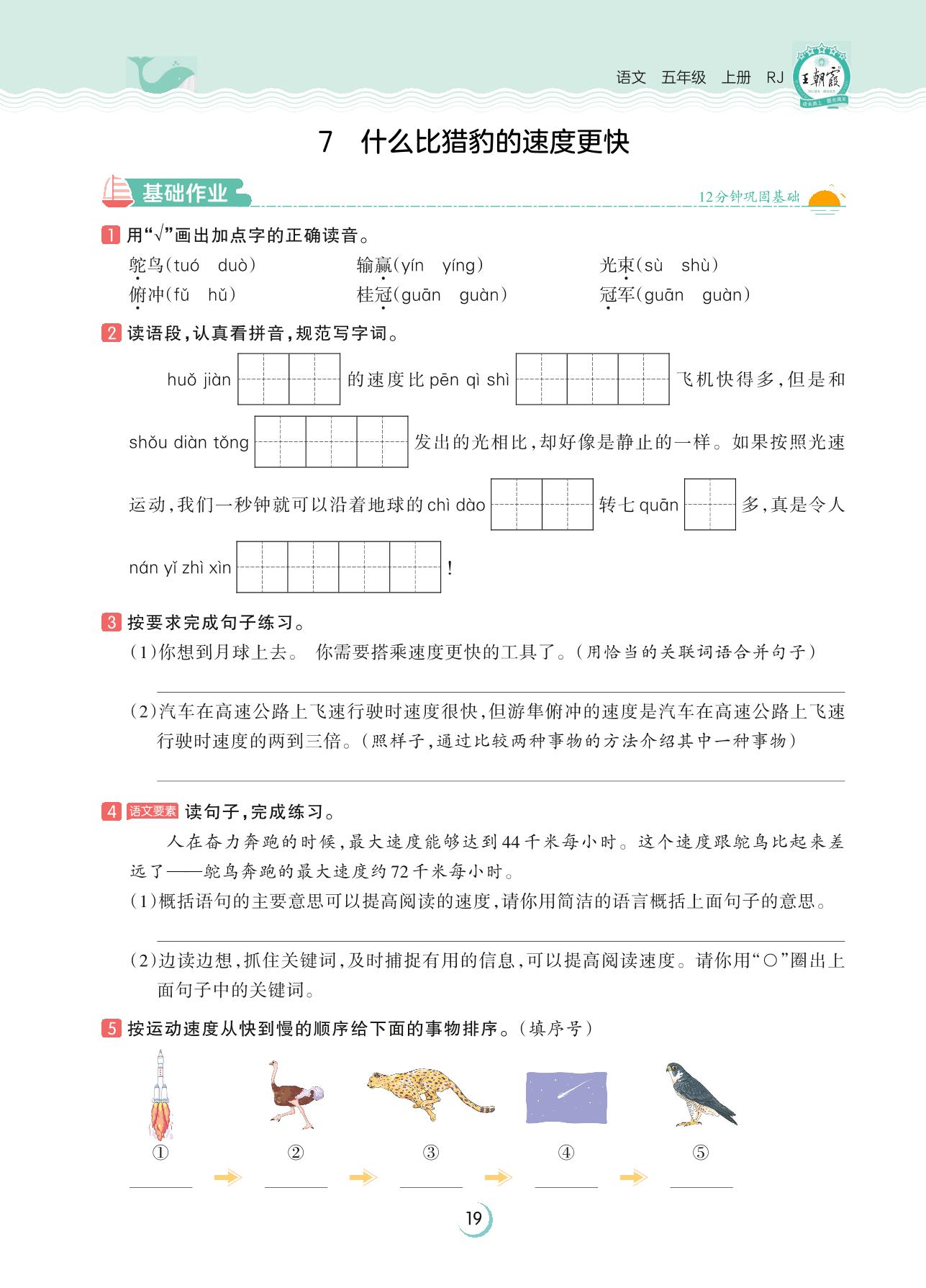 2023上册五年级语文人教版 第二单元 阅读策略 提高阅读速度——7 什么比猎豹的速度更快