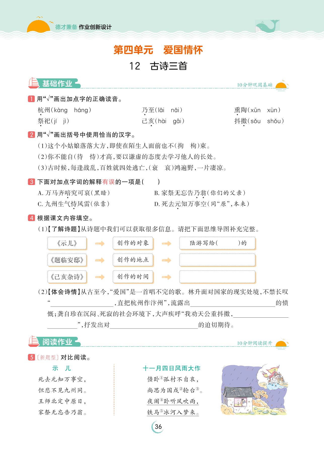 2023上册五年级语文人教版 第四单元 爱国情怀——12 古诗三首