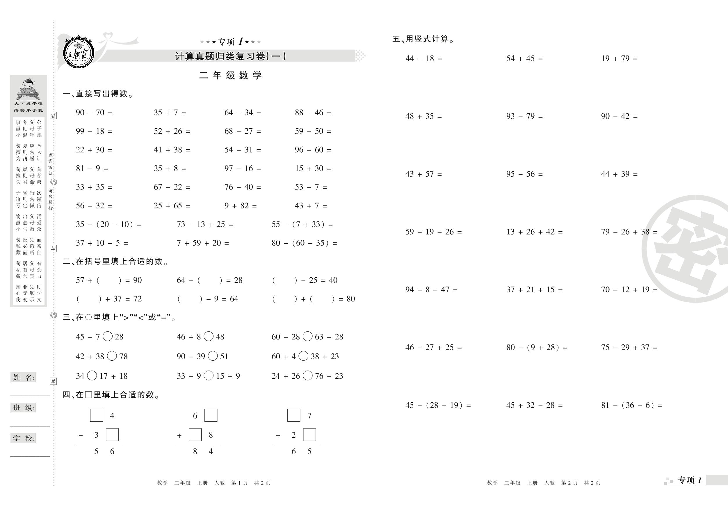 王朝霞期末专项卷——计算真题归类复习二年级上册数学(人教版)_R21080394059【0】