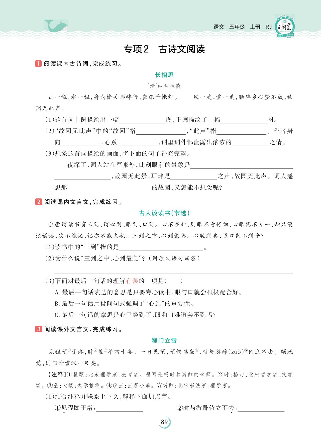 2023上册五年级语文人教版 新题新视野 专项训练——专项2 古诗文阅读