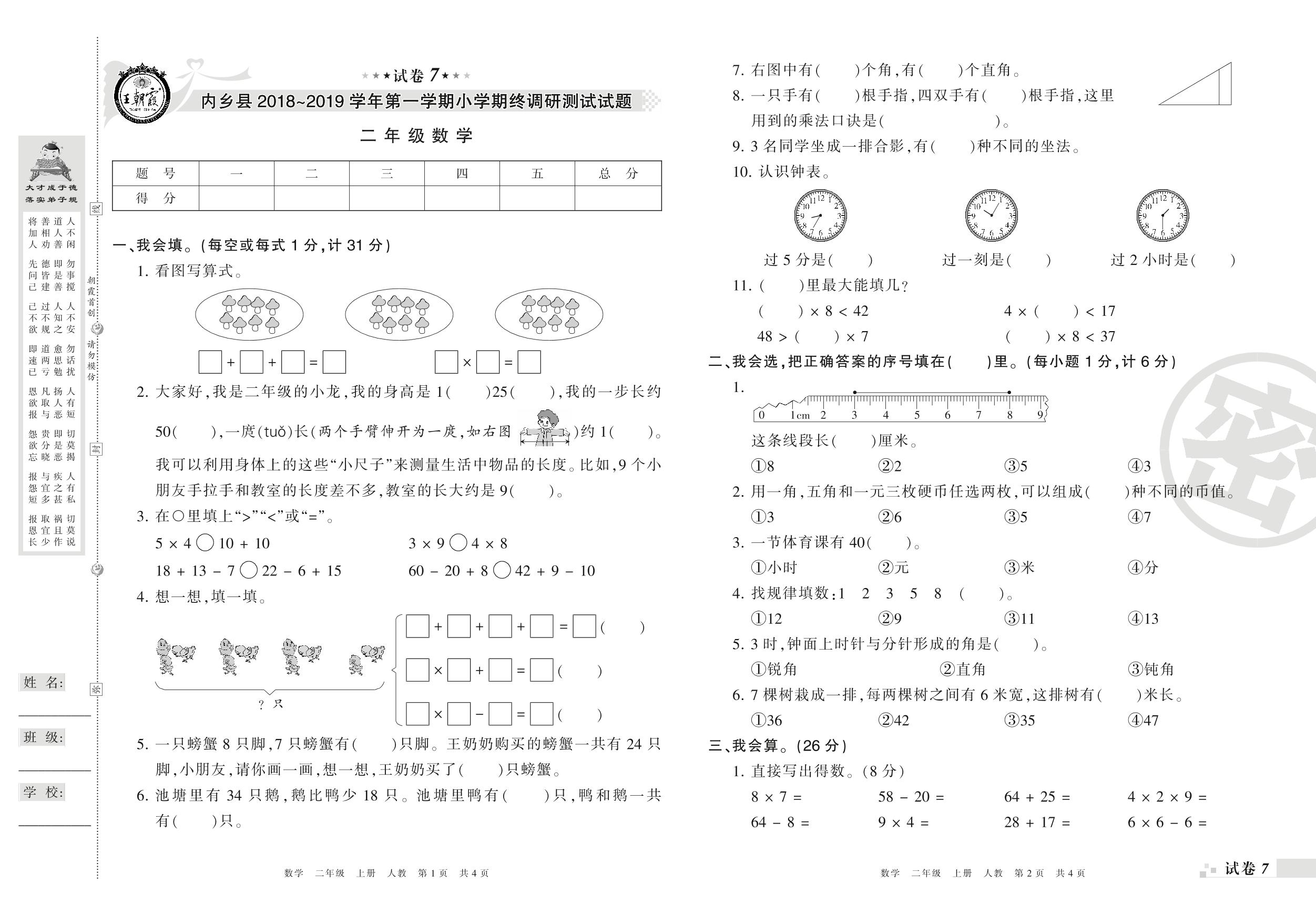 2018-2019学年第一学期南阳市内乡县二年级数学试卷(人教版)【7】
