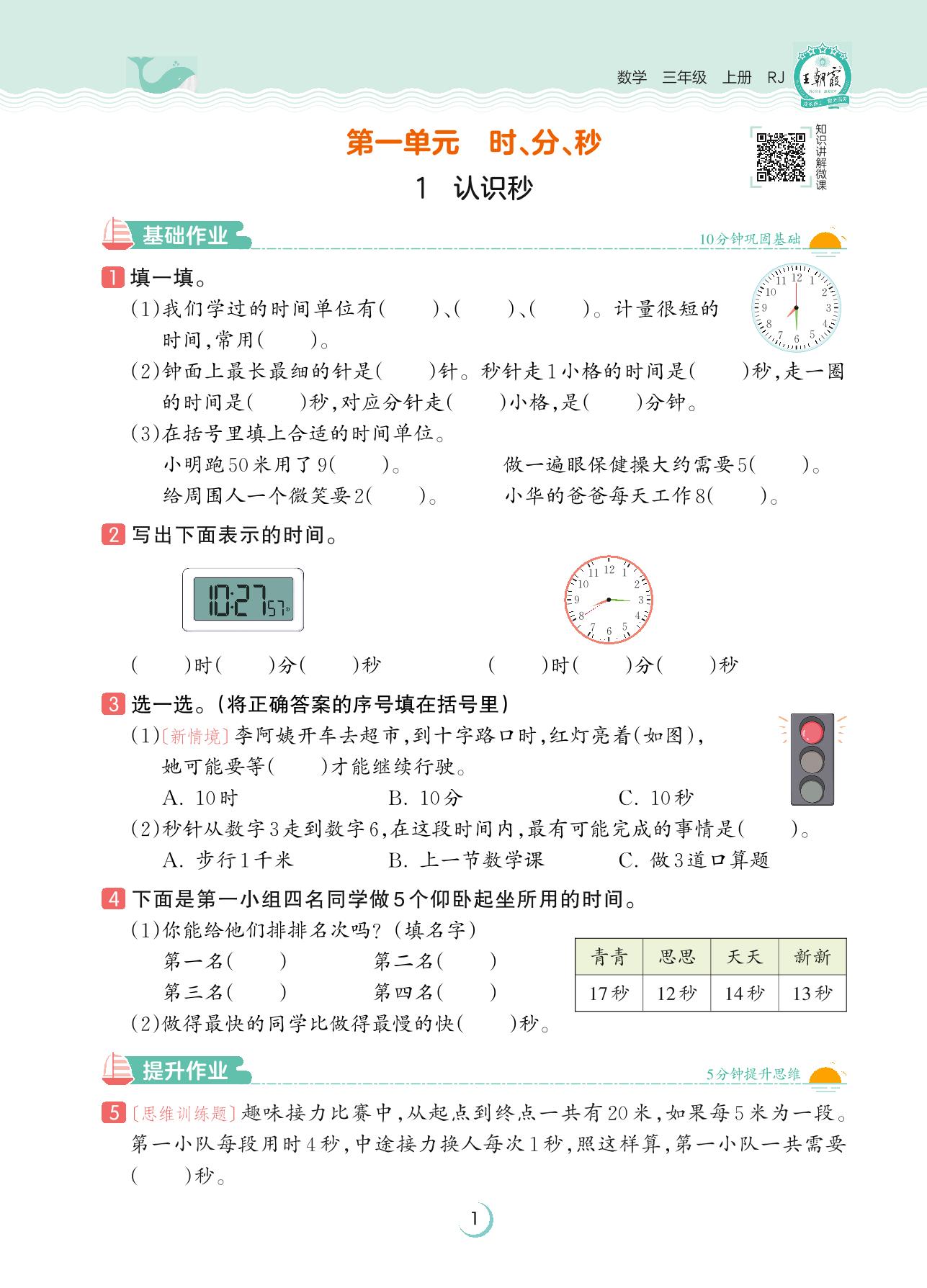 2023上册三年级数学人教版 第一单元 时、分、秒——1 认识秒