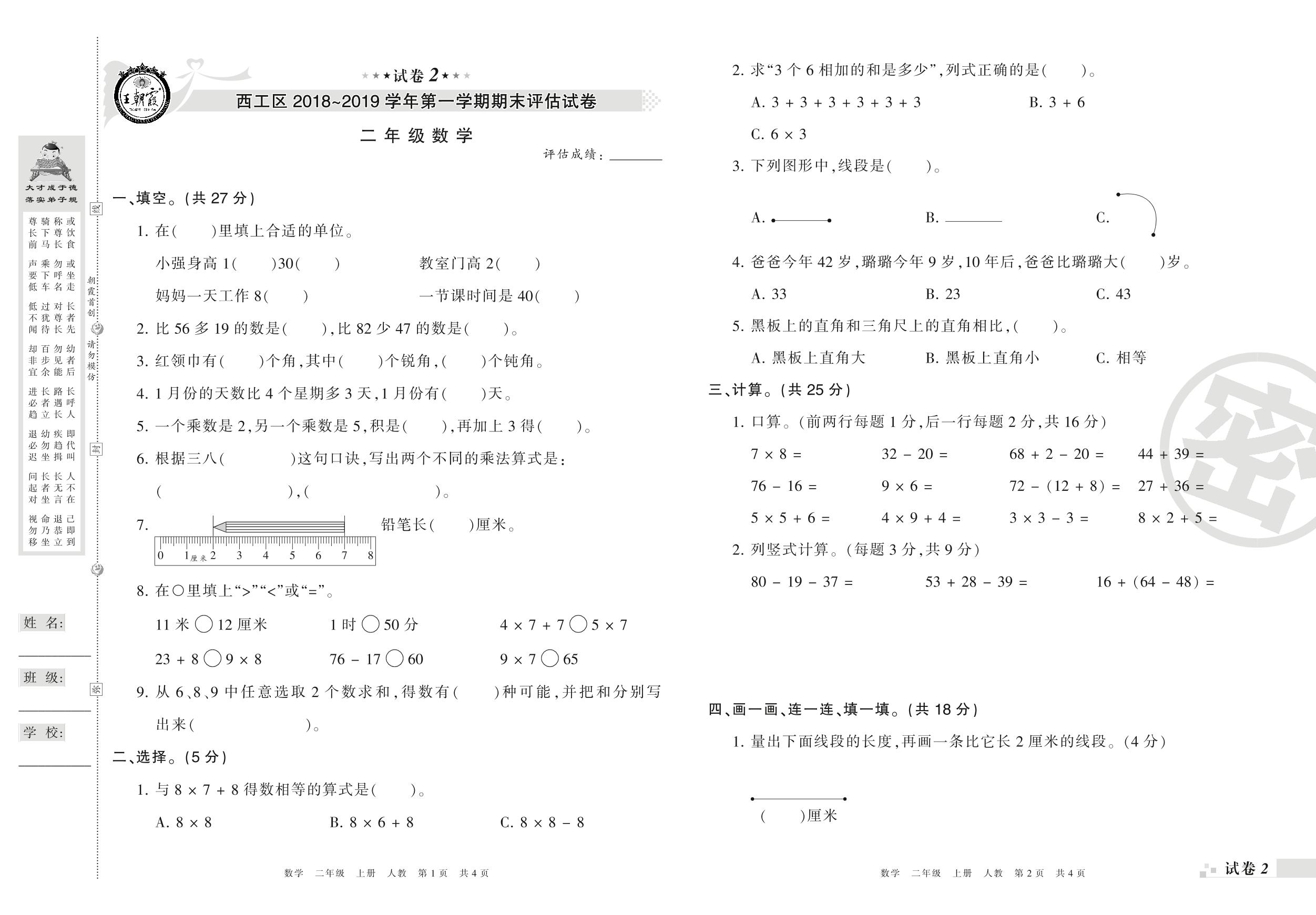 2018-2019学年第一学期洛阳市西工区二年级数学试卷(人教版)【2】