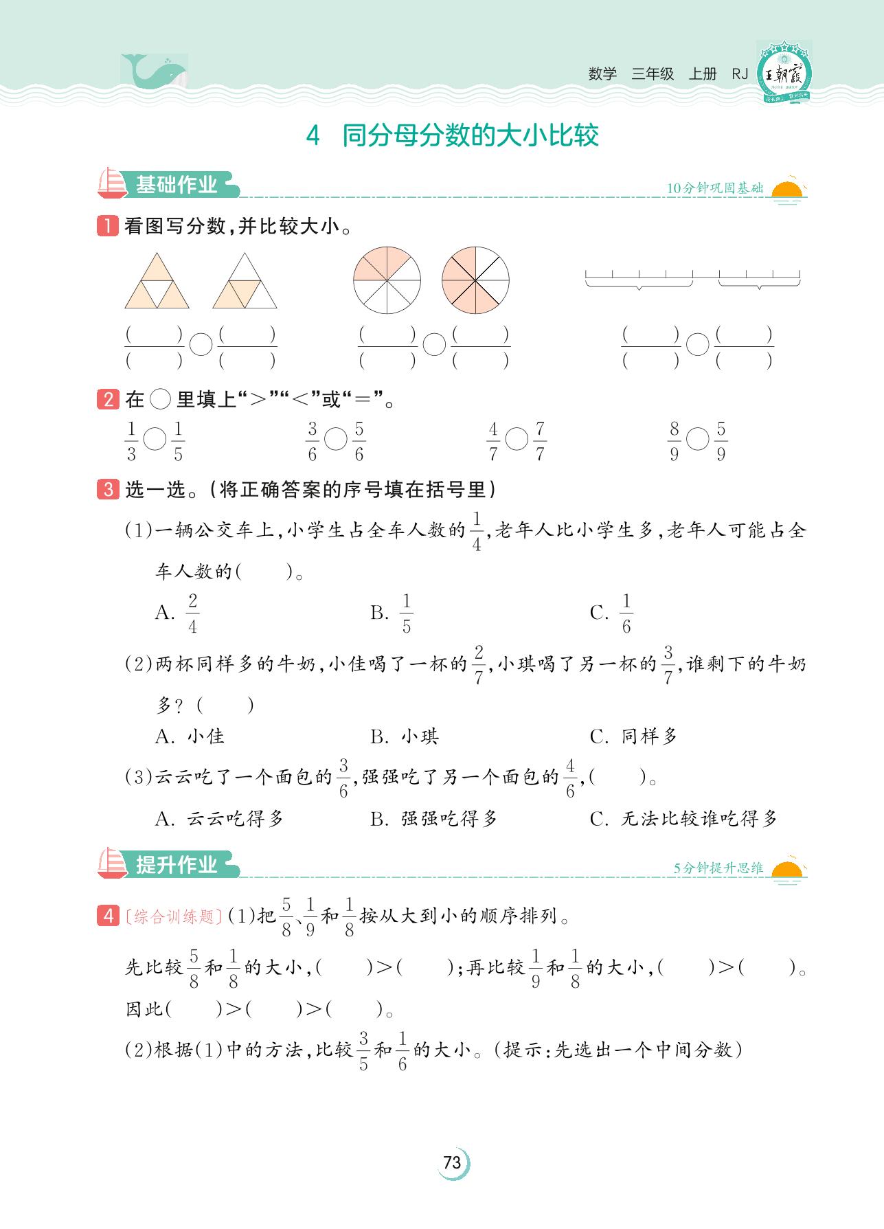 2023上册三年级数学人教版 第八单元 分数的初步认识——4 同分母分数的大小比较