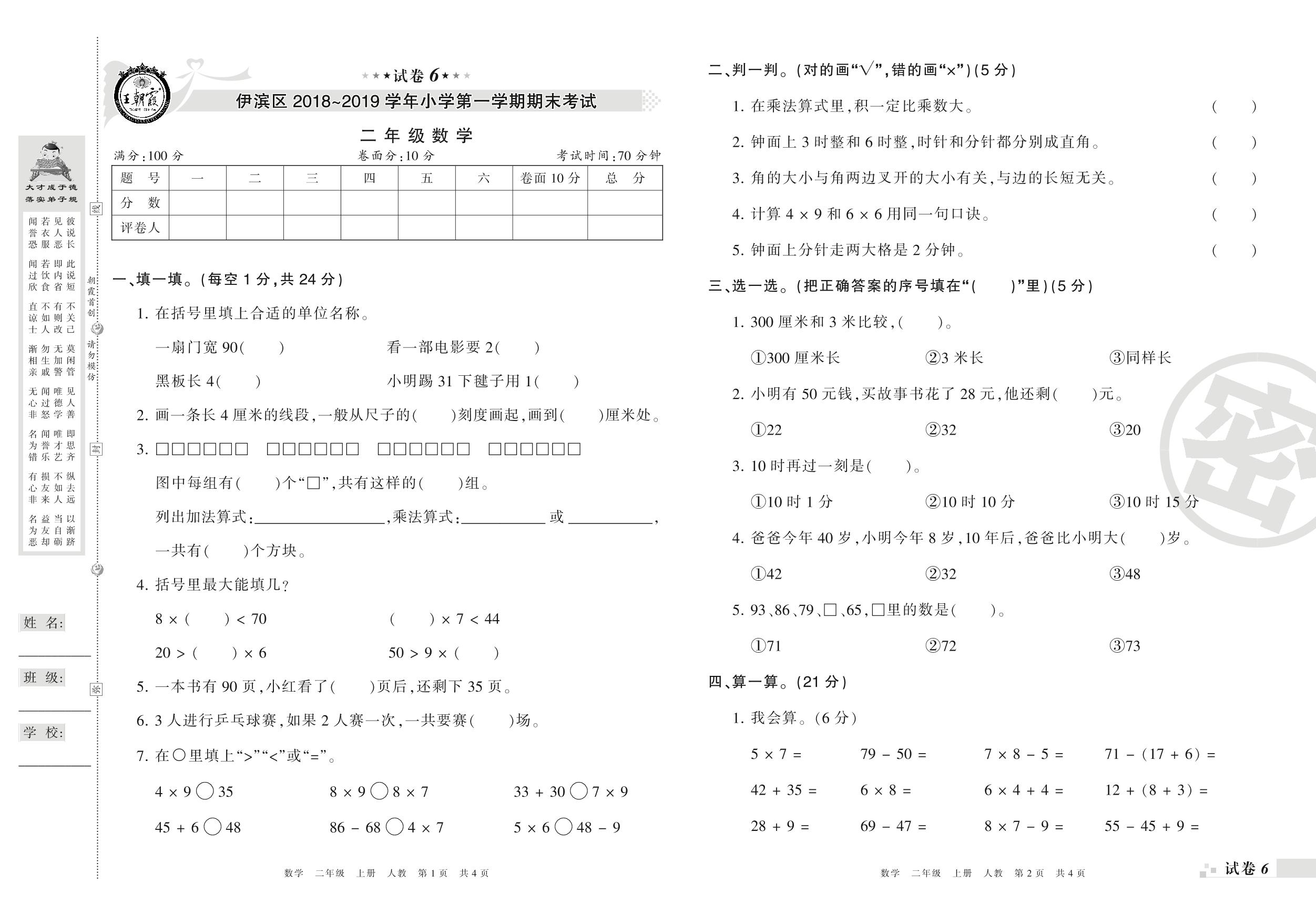 2018-2019学年第一学期洛阳市伊滨区二年级数学试卷(人教版)【6】