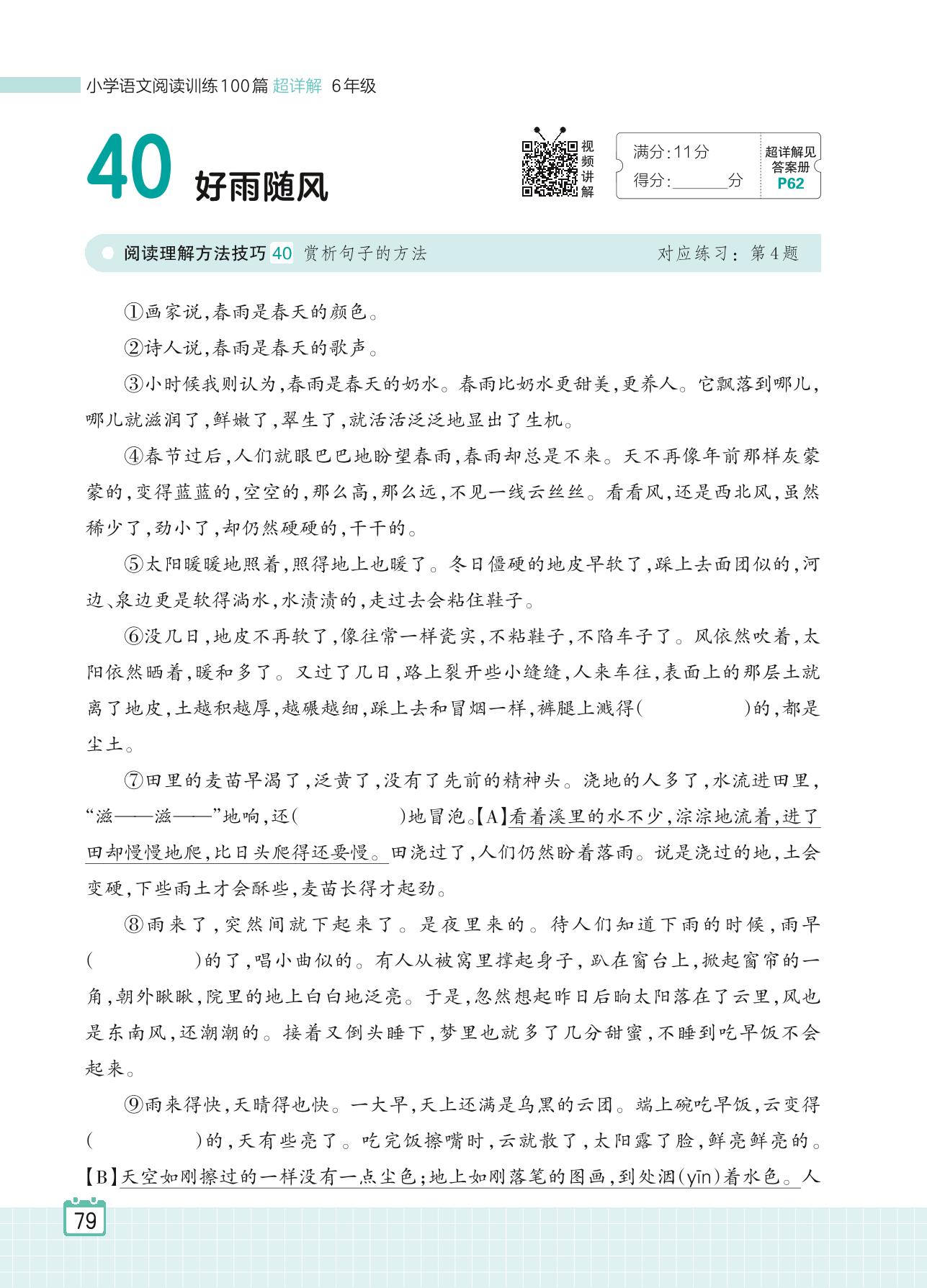 2024全一册六年级语文人教版 专题三 写景状物 40 好雨随风