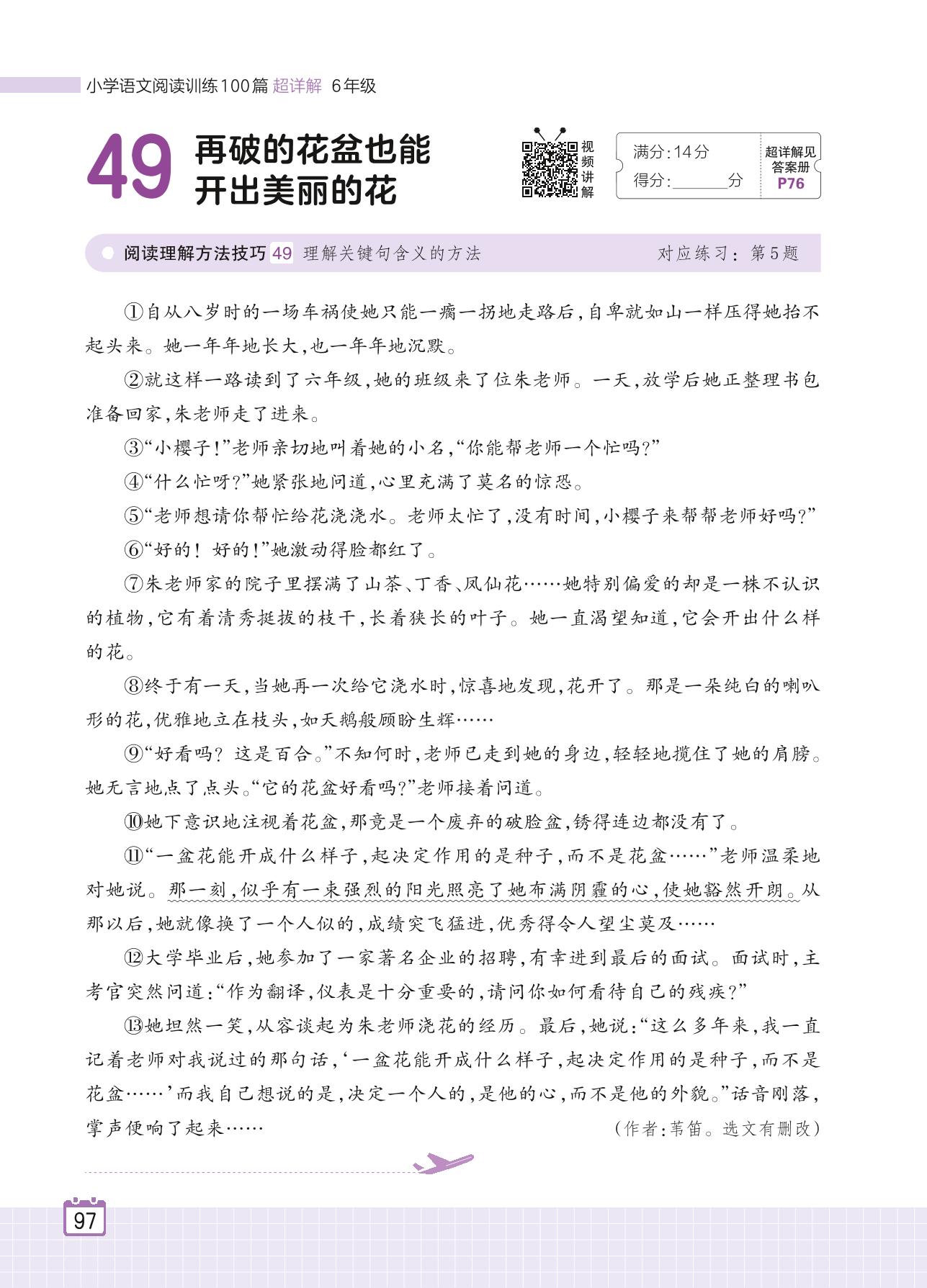 2024全一册六年级语文人教版 专题四 小说 49 再破的花盆也能开出美丽的花