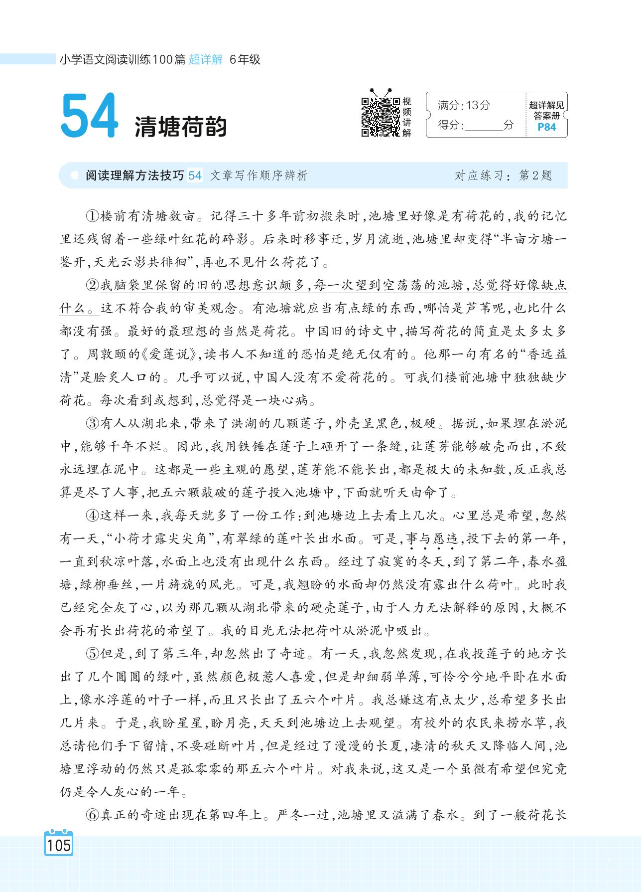 2024全一册六年级语文人教版 专题五 散文 54 清塘荷韵