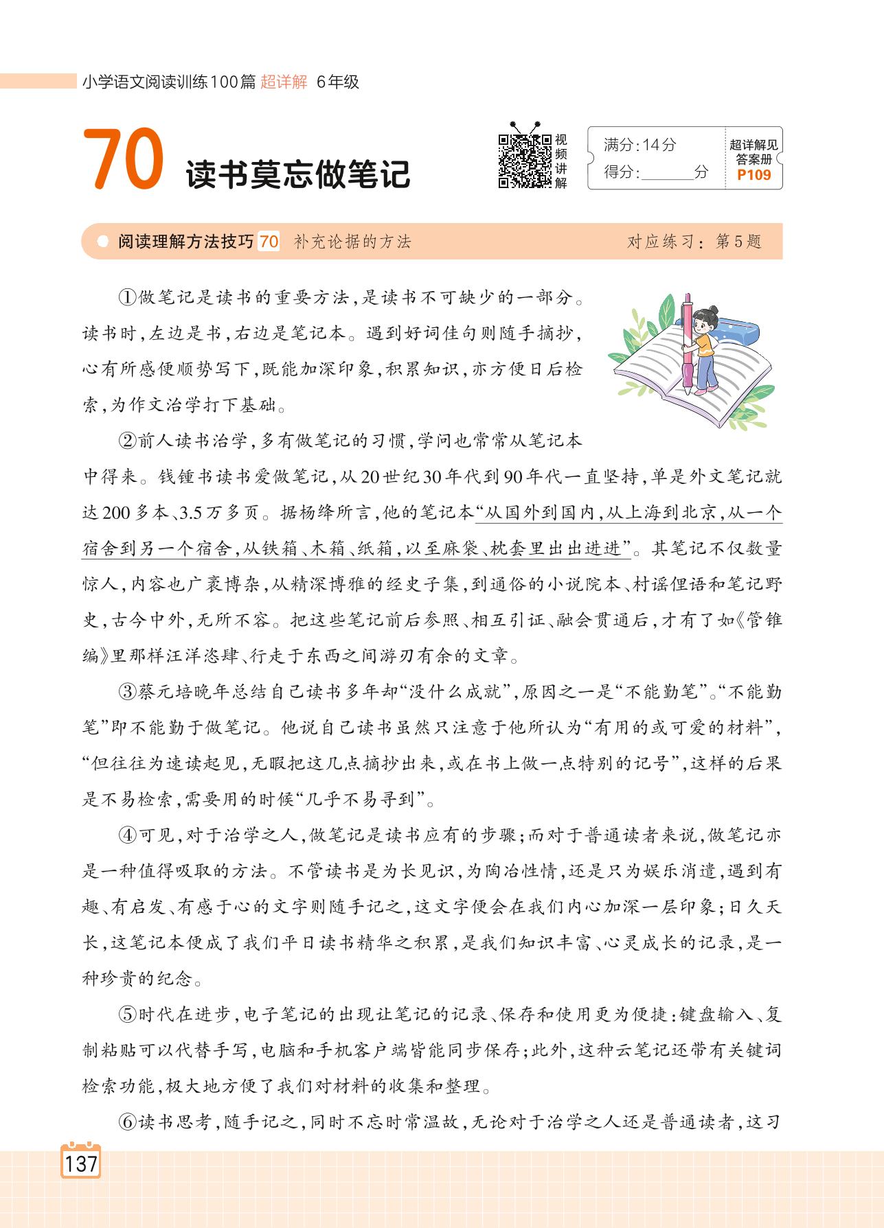 2024全一册六年级语文人教版 专题七 议论文 70 读书莫忘做笔记