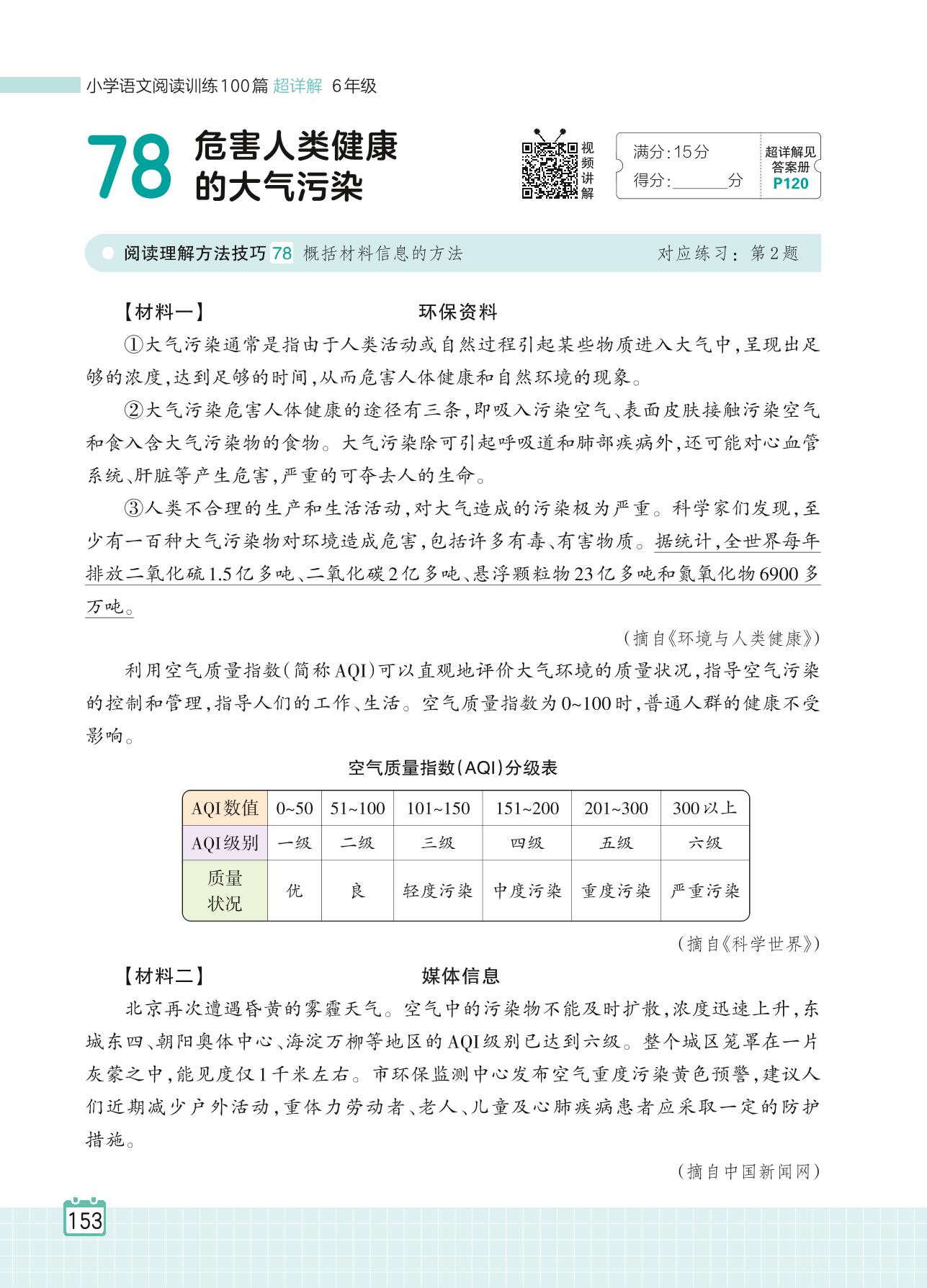 2024全一册六年级语文人教版 专题八 非连续性文本阅读 78 危害人类健康的大气污染
