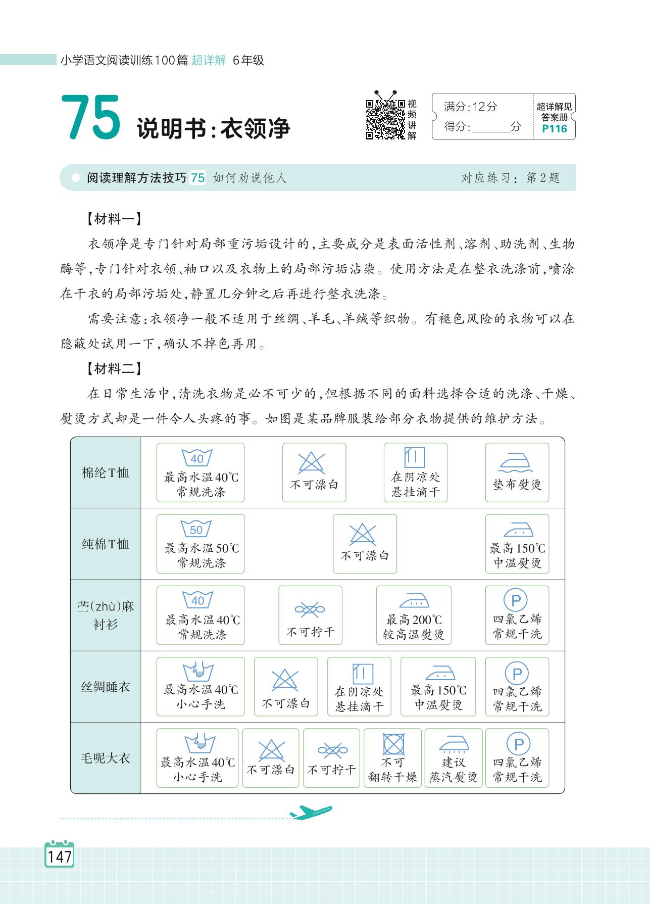 2024全一册六年级语文人教版 专题八 非连续性文本阅读 75 说明书:衣领净