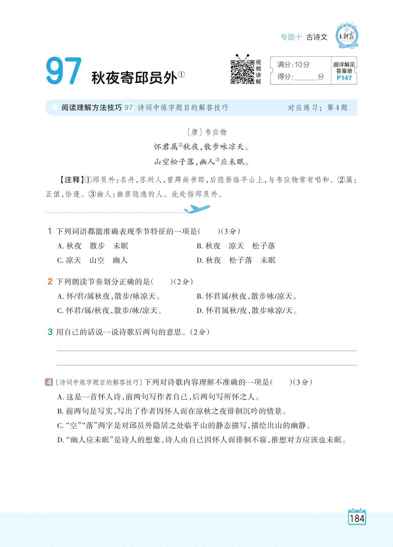 2024全一册六年级语文人教版 专题十 古诗文 97 秋夜寄邱员外