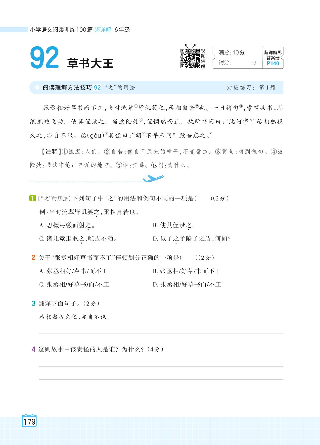 2024全一册六年级语文人教版 专题十 古诗文 92 草书大王