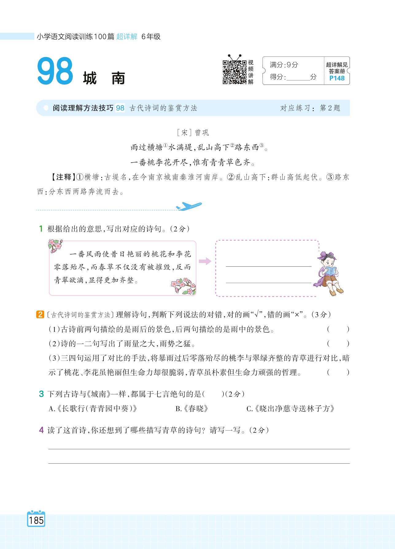 2024全一册六年级语文人教版 专题十 古诗文 98 城南
