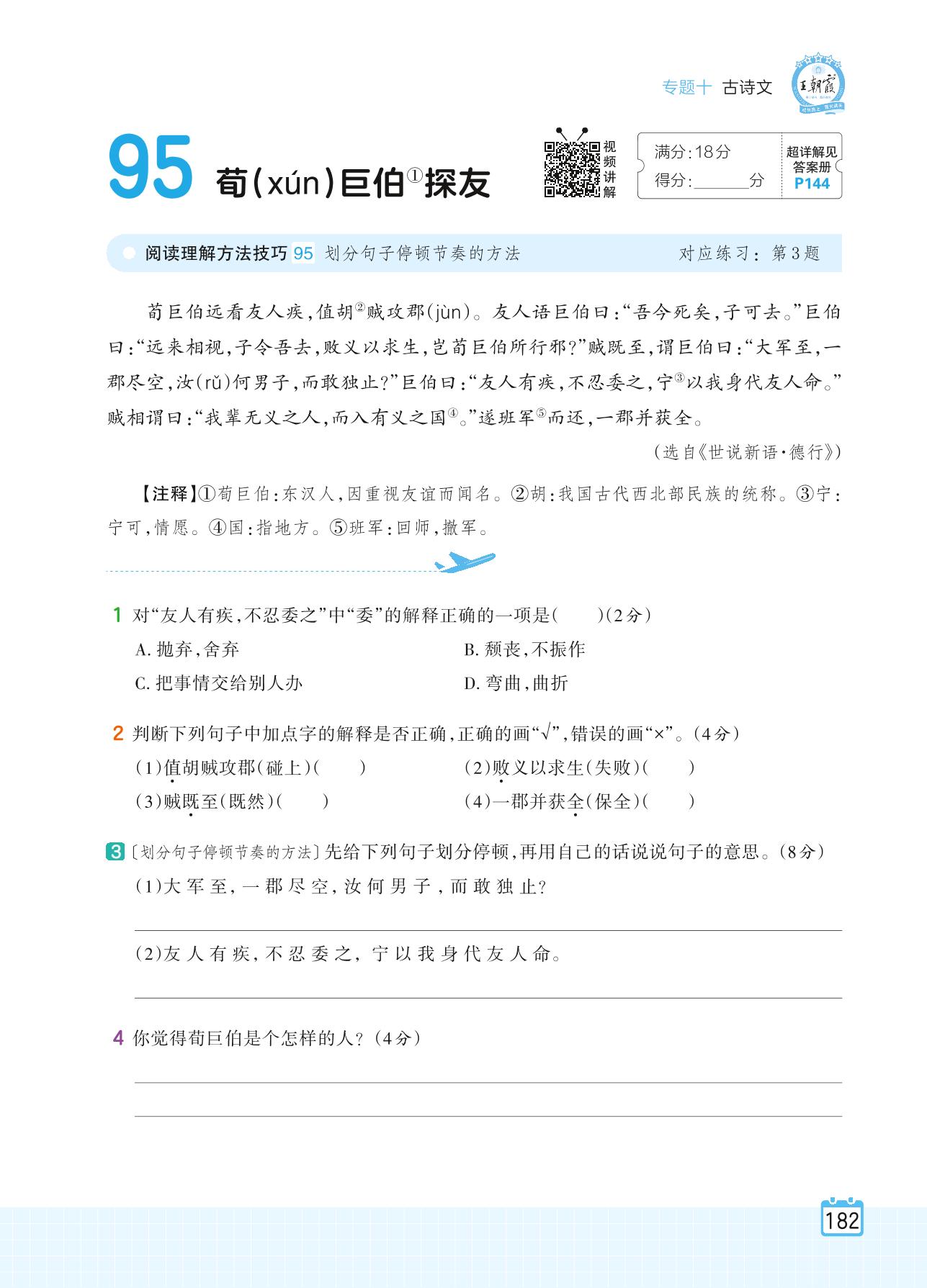 2024全一册六年级语文人教版 专题十 古诗文 95 荀巨伯探友