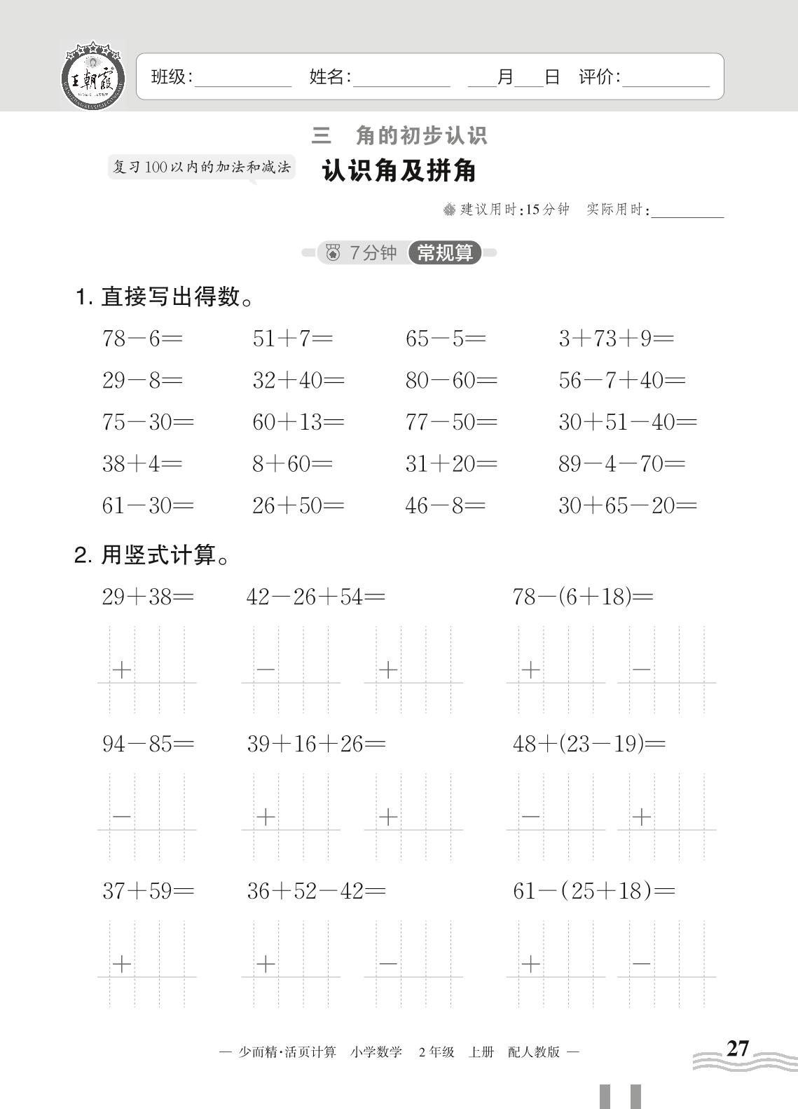 2023上册二年级数学人教版 三 角的初步认识——认识角及拼角