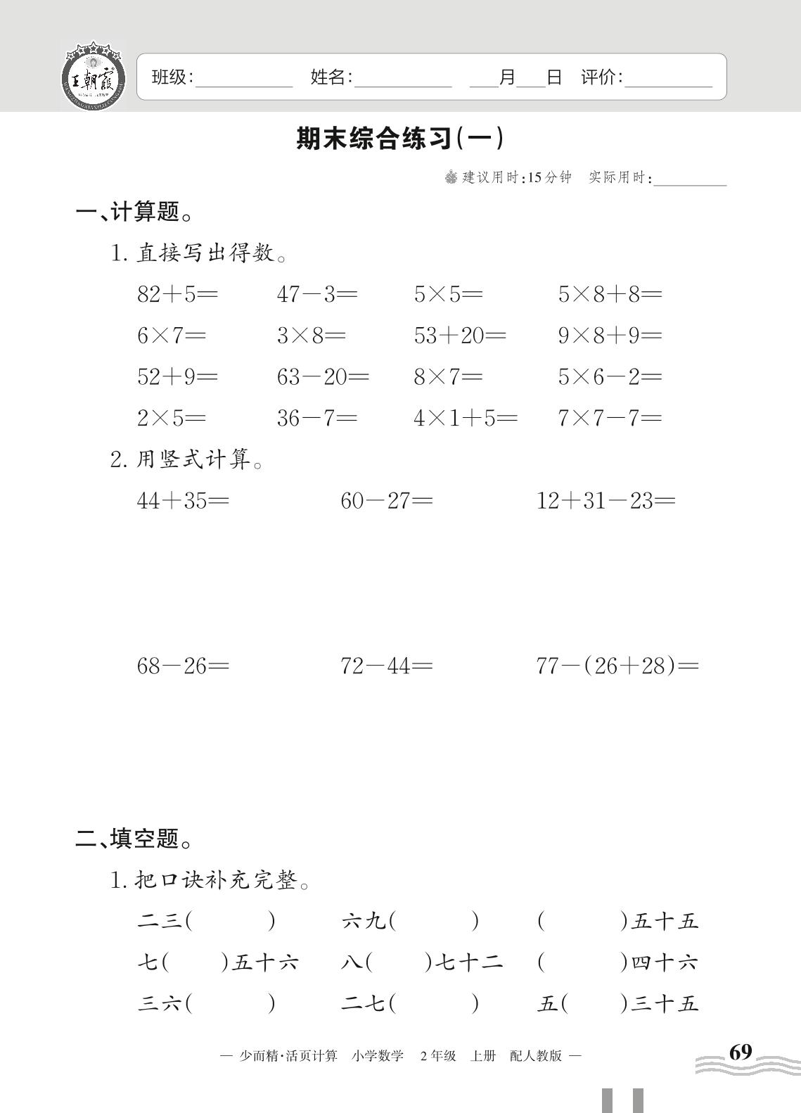 2023上册二年级数学人教版 期末综合练习(一)(计算专练)