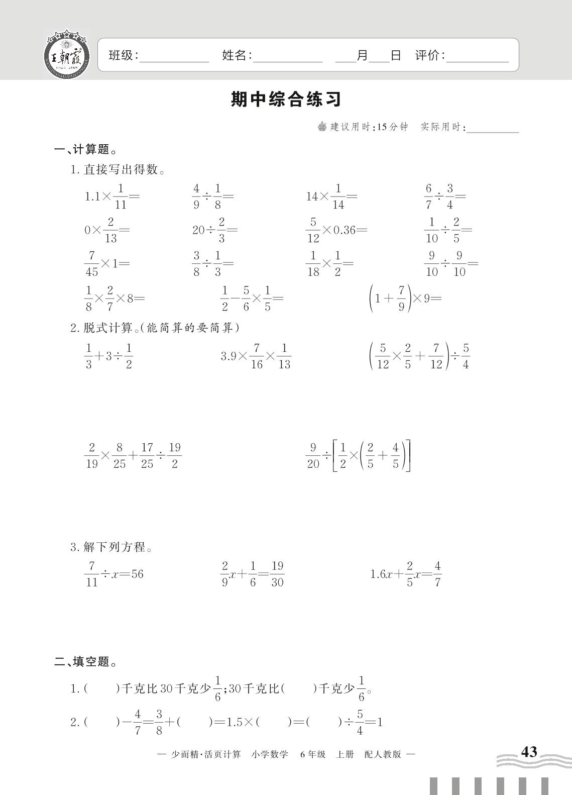 2023上册六年级数学人教版 期中综合练习(计算专练)