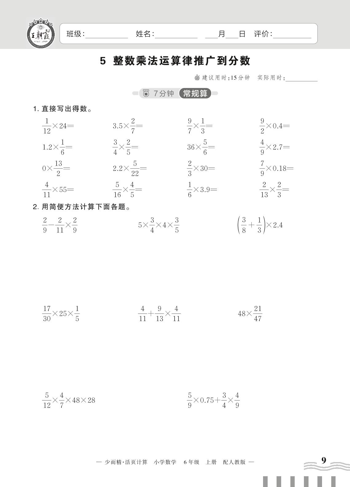 2023上册六年级数学人教版 一 分数乘法——5 整数乘法运算律推广到分数