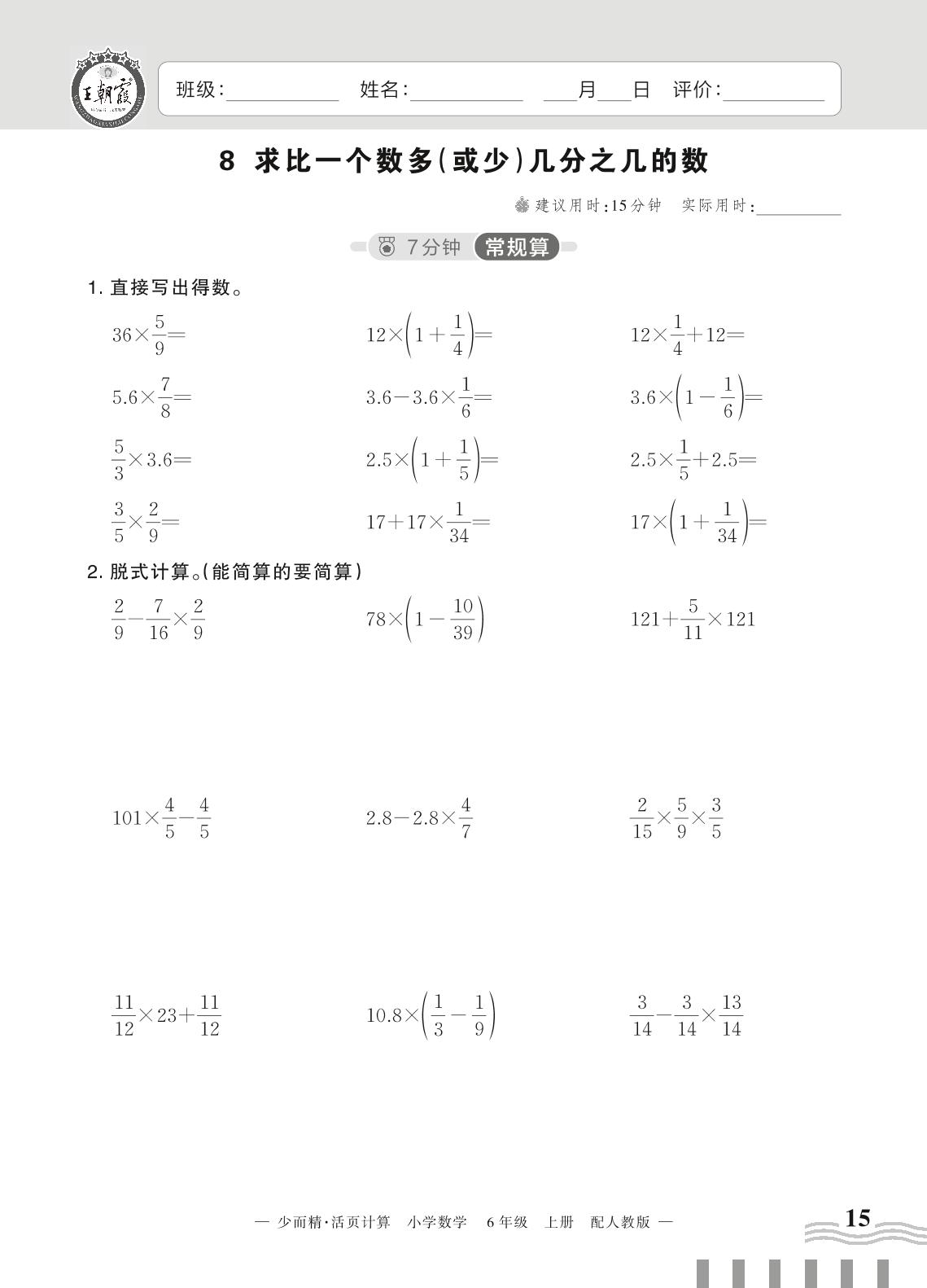2023上册六年级数学人教版 一 分数乘法——8 求比一个数多(或少)几分之几的数