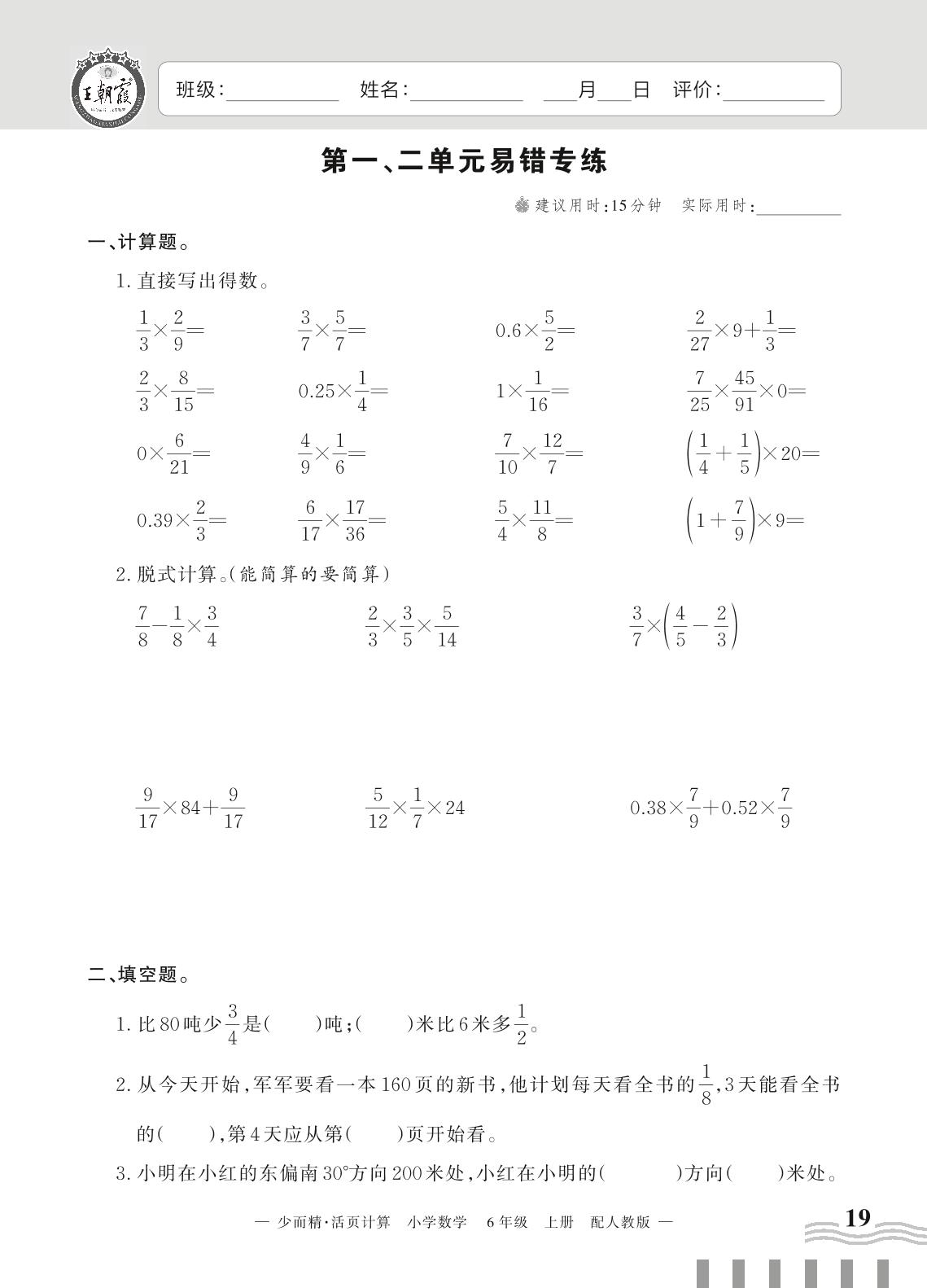 2023上册六年级数学人教版 第一、二单元易错专练
